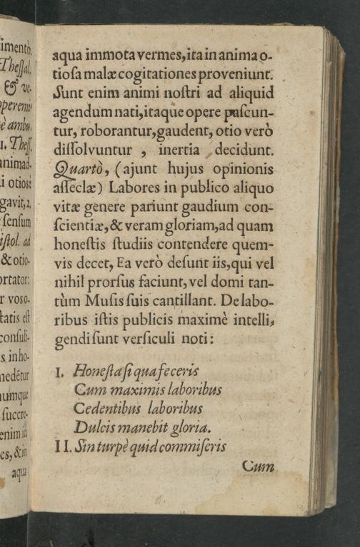 aqua immota vermes, itain animao- tioſa malæ cogitationes proveniunt. Junt enim animi noſtri ad aliquid agendum nati, itaque opere paſcun- tur, roborantur,gaudent, otio verd diſſolvuntur„ inertia decidunt. Quartò,(ajunt hujus— aſſeclæ) Labores in publico aliquo vitæ genere pariunt gaudium con- ſcientiæ,& veram gloriamad quam honeſtis ſtudiis contendere quem- vis decet, ka verd deſunti iis, qui vel nihil prorſus faciunt vel domi tan- tum Muſis ſuis cantillant. Pe labo- ribus iſtis publicis t maximeè intelli⸗ gendi ſunt verſiculi noti: