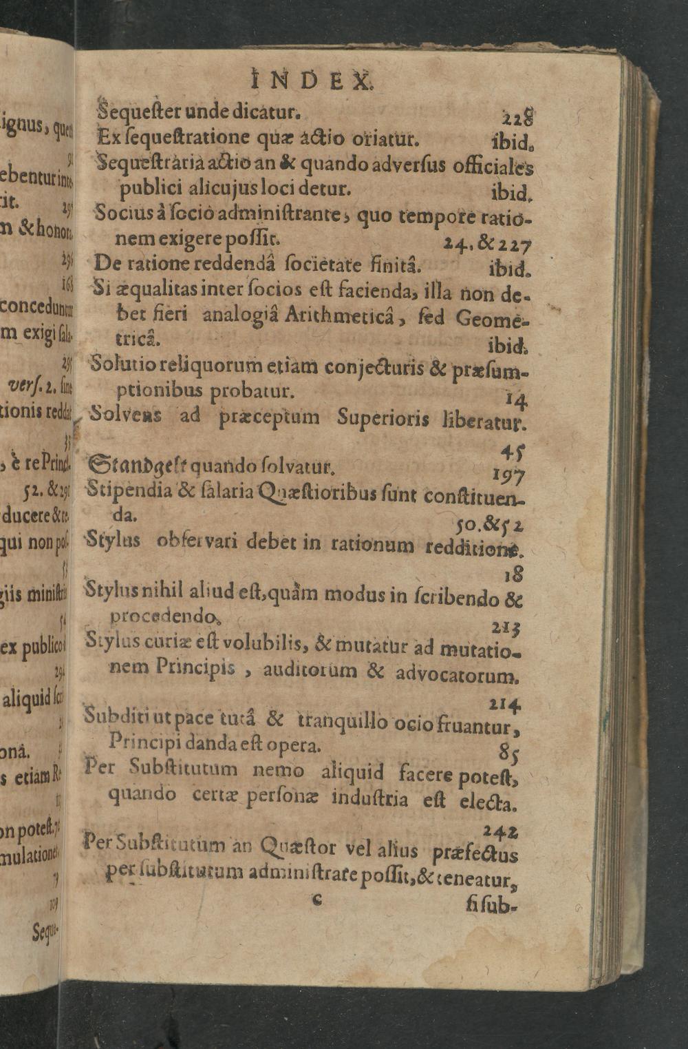 Sequrſtratia actio an& quando adverſus officiales publici alicujus loci detur. ibid. Socius ã ſociò adminiſtrante, quo tempote ratio- nem exigere poſſit. 24.& 227 ibd. Si æqualitas inter ſocios eſt faeiendas illa non de- bet fieri analogiã Arithmeticã, fed Geome.⸗