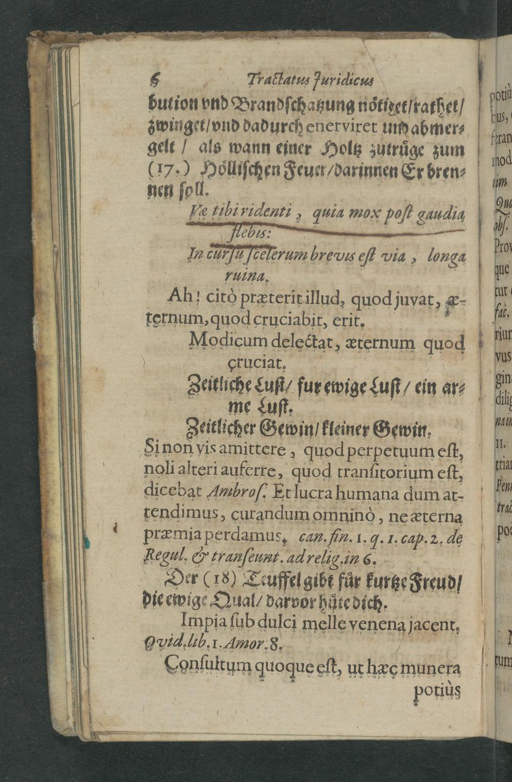 yuimna Ah! cit præterit illud, quodijuvat,* ternum, quod cruciabit, erit. Modicum delcetat, æternum gruciat. Zeitliche Luſt/ fur ewige Luſt/ ein ar⸗ me Luſt. Zeitlicher Gewin/ kleiner Gewin. Si non vis amittere quod perpetuume eſt, noli alteri auferre, quoq tranſitorium eſt. dicehat Ambroſt Pt jucra humana dum at- tendimus, curandum omninò, ne æterna præmia perdamus, can. In. 1.. 1. c4p. 2. Regul cranſeunt. 44 reli. n 6. Der(1) 4 Tuffel gibt für kurtze Freud/ die ewige Qual⸗ darvor häte dich. Impia ſub dulci melle venena jacent. OVid lib. 1 Amur.§. Conſukum quoque eſt, ut munera potis