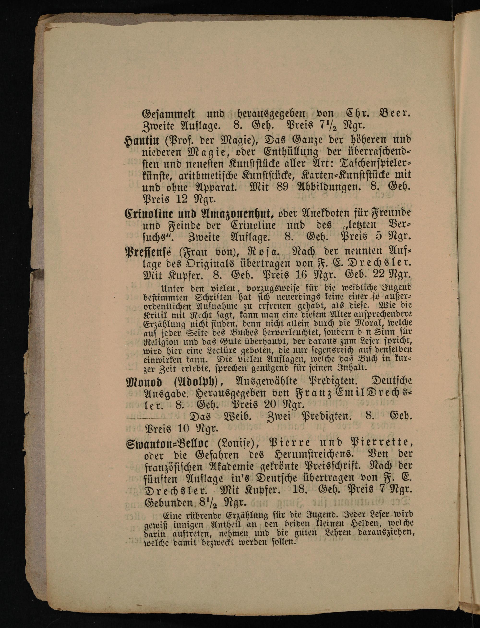 Preſſenſé(Frau von), Roſa. Nach der neunten Auf⸗ lage des Originals übertragen von F. E. Drechsler. Mit Kupfer. 8. Geh. Preis 16 Ngr. Geb. 22 Ngr.