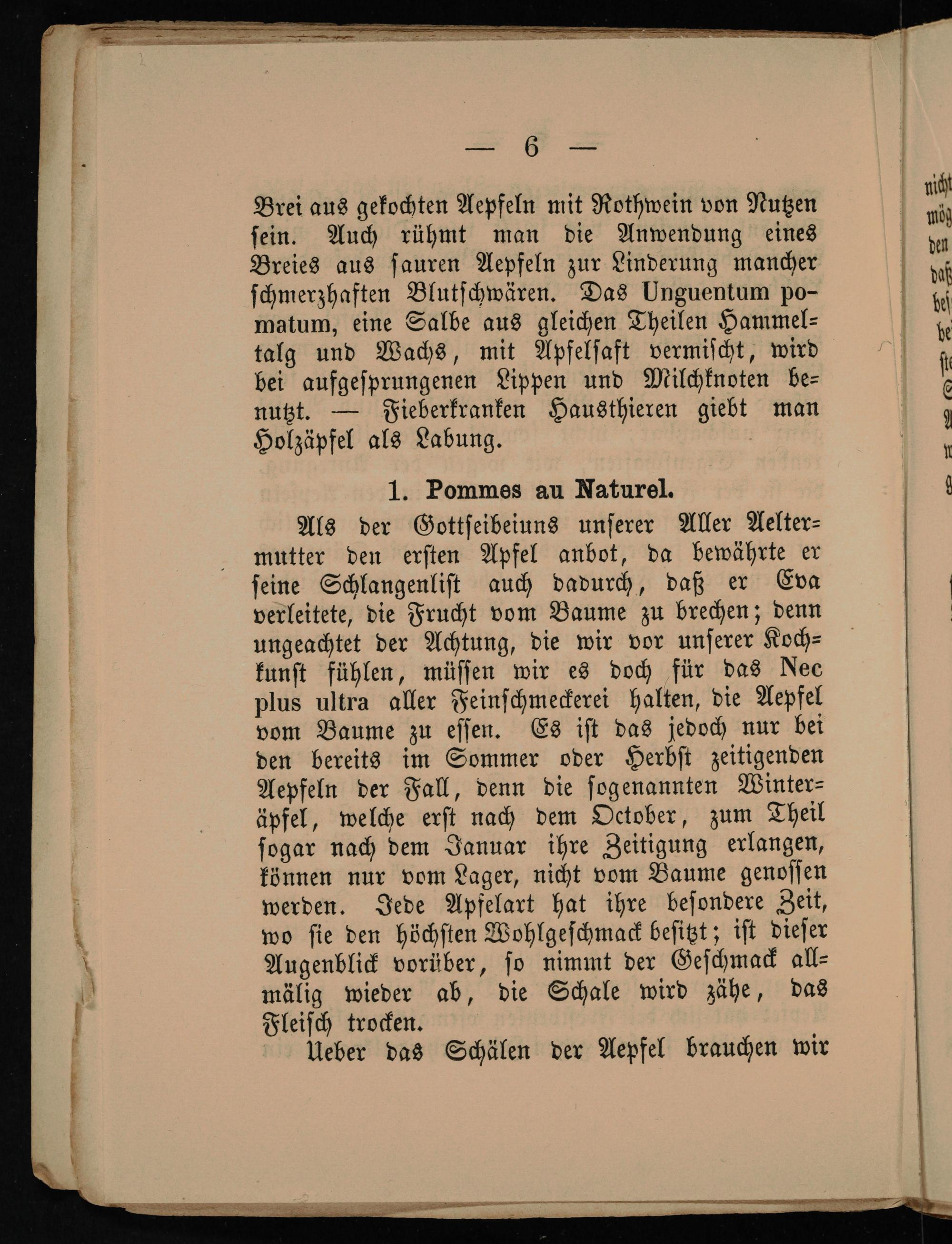 Brei aus gekochten Aepfeln mit Rothwein von Nutzen ſein. Auch rühmt man die Anwendung eines Breies aus ſauren Aepfeln zur Linderung mancher ſchmerzhaften Blutſchwären. Das Unguentum po- matum, eine Salbe aus gleichen Theilen Hammel⸗ talg und Wachs, mit Apfelſaft vermiſcht, wird bei aufgeſprungenen Lippen und Milchknoten be⸗ nutzt.— Fieberkranken Hausthieren giebt man Holzäpfel als Labung. b
