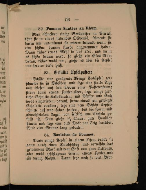 unl Schäle eine genügende Menge Kochäpfel, zer⸗ miütr ſchneide ſie in Scheiben und lege eine ſtarke Lage i nn von dieſen auf den Boden einer Paſtetenform; t lir ſtreue dann etwas Zucker über, lege einige zier⸗ ſede⸗ liche Schnitte Kalbsbraten, mit Pfeffer und Salz augſan wohl eingerieben, darauf, ſtreue etwas fein gewiegte 4 Schalotte darüber, lege eine neue Schicht Aepfel⸗ ſchnitte auf und fahre ſo fort, bis die Form mit . abwechſelnden Lagen von Fleiſch und Aepfeln ge— anse füllt iſt. Nun gieße ½ Quart gute Bouillon daß ſ hinein und lege eine dicke Decke von Teig darüber. ntben Wird eine Stunde lang gebacken. werdel. * ſh 84. Boulettes de Pommes. egentlit Brate einige Aepfel in einem Ofen, drücke ſie upft, ſt dann durch einen Durchſchlag und verwiſche das lih gart, gewonnene Mark mit dem Saft von zwei Citronen, uß d vier wohl geſchlagenen Eiern, etwas Zucker und