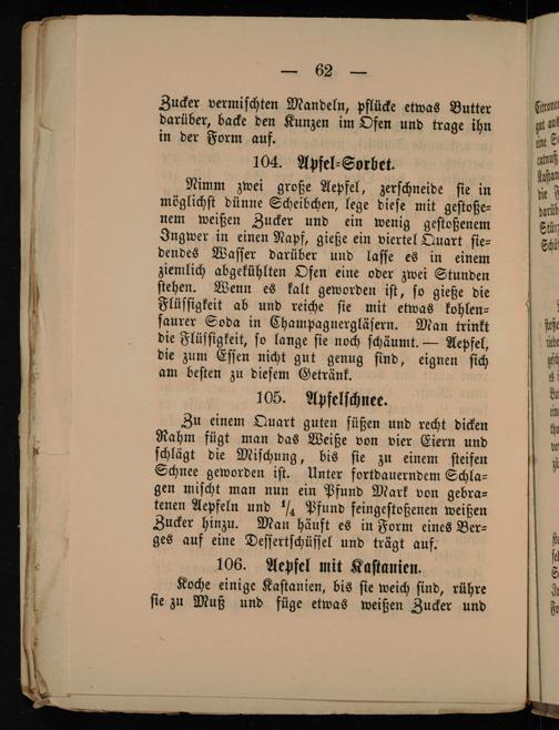 106. Aepfel mit Kaſtanien. Koche einige Kaſtanien, bis ſie weich ſind, rühre ſie zu Muß und füge etwas weißen Zucker und