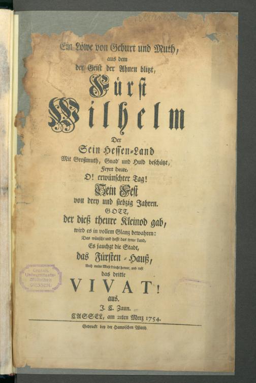 Ein Löwe von Geburt und Muth, aus dem der Geist der Ahnen blizt, Fürst Wilhelm Der Sein Hessen-Land Mit Großmuth, Gnad' und Huld beschüzt, feyrt heute, O! erwünschter Tag! Sein Fest von Drey und Siebzig Jahren. Oder der dieß theure Kleinod gab, wird es in vollem Glanz bewahren: Das Wünscht und hofft das treue Land, Es jauchzt die Stadt, das Fürsten-Hauß, auch meine Rufe kriecht hervor, und ruft das dritte Vivat! aus. / J. G. Zaun.