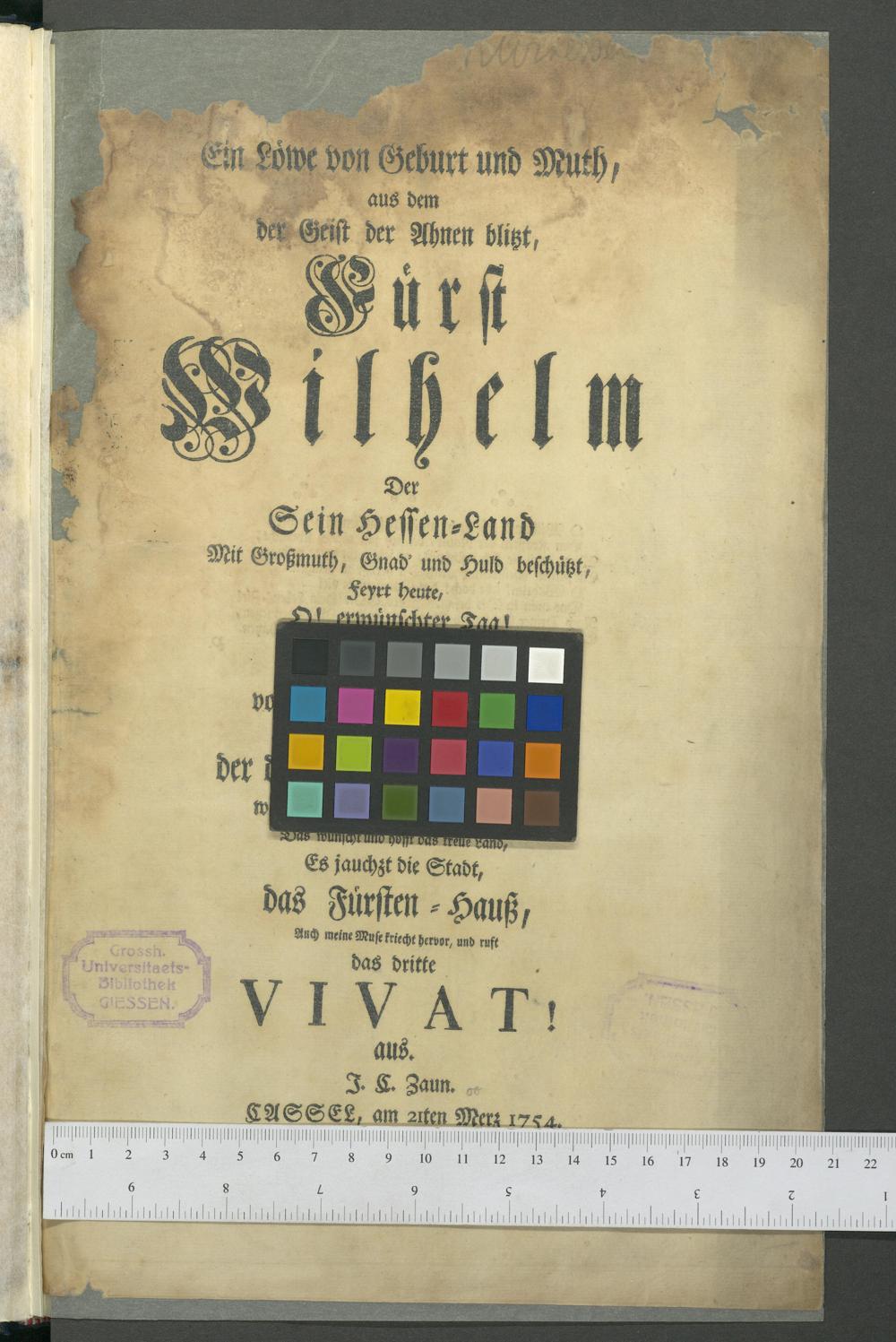 Ein Löwe von Geburt und Muth, aus dem der Geist der Ahnen blizt, Fürst Wilhelm Der Sein Hessen-Land Mit Großmuth, Gnad' und Huld beschüzt, feyrt heute, O! erwünschter Tag! Sein Fest von Drey und Siebzig Jahren. Oder der dieß theure Kleinod gab, wird es in vollem Glanz bewahren: Das Wünscht und hofft das treue Land, Es jauchzt die Stadt, das Fürsten-Hauß, auch meine Rufe kriecht hervor, und ruft das dritte Vivat! aus. / J. G. Zaun.