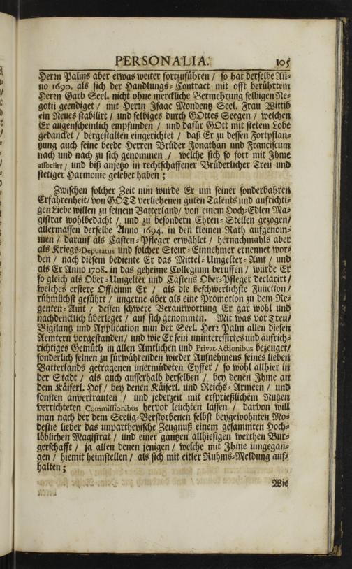 Eine Wohl-vollbrachte Ritterschafft Und Wallfahrt zur ewigen Wohlfahrt, Dardurch man des Himmlischen Kleinods wird theilhafft : In einer sonderbahren Leichen-Rede, Aus 2. Tim. IV,7. 8. Nach dem seeligen Ableiben Des ... Herrn Johann Heinrich Palmen ... Hof-Jubiliers, und Niederlags-Verwandten zu Wien ... Als Derselbe ... 1710. den 18. Aprilis allda seelig gestorben ... / Vorgestellt und auf Begehren ausgefertiget Von M. Ludwig Carl Ditzinger, Ministerii Seniore
