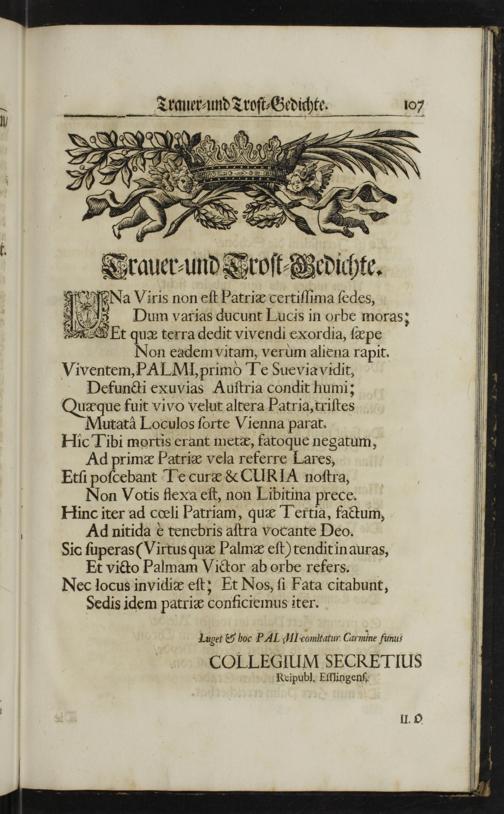 Eine Wohl-vollbrachte Ritterschafft Und Wallfahrt zur ewigen Wohlfahrt, Dardurch man des Himmlischen Kleinods wird theilhafft : In einer sonderbahren Leichen-Rede, Aus 2. Tim. IV,7. 8. Nach dem seeligen Ableiben Des ... Herrn Johann Heinrich Palmen ... Hof-Jubiliers, und Niederlags-Verwandten zu Wien ... Als Derselbe ... 1710. den 18. Aprilis allda seelig gestorben ... / Vorgestellt und auf Begehren ausgefertiget Von M. Ludwig Carl Ditzinger, Ministerii Seniore