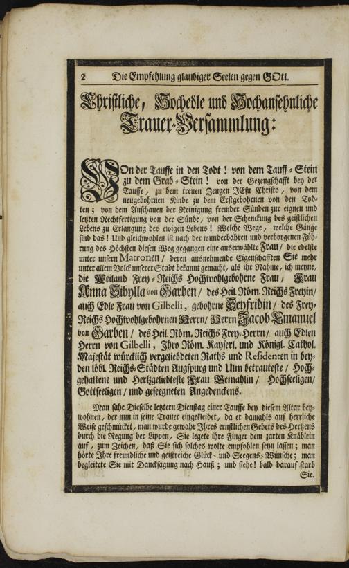 Die Empfehlung glaubiger Seelen gegen Gott : Wurde Bey der solennen Leichen-Begängniß der Weyland Frey-Reichs-Hochwohlgebohrnen Frauen, Frauen Anna Sibylla von Garben, Des Heil. Röm. Reichs-Freyin, auch Edler Frauen von Gibelli, gebohrner Seyfridin, hochseeligen und gesegneten Angedenckens, alls dieselbe im Jahr Christi 1740, Dienstags den 12. Jenner in dem 61ten Jahr ... entrissen ... Einer Hoch-Adelichen, Hoch- und Wohl-Ehrwürdigen und Hochansehnlichen Trauer-Versammlung von dem Altar gehaltenen Trauer-Sermon vorgestellet / von Samuel Widemann, Pfarrer zu St. Ulrich Augsp. Conf.