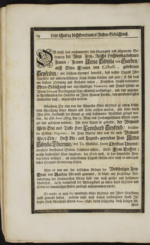 Die Empfehlung glaubiger Seelen gegen Gott : Wurde Bey der solennen Leichen-Begängniß der Weyland Frey-Reichs-Hochwohlgebohrnen Frauen, Frauen Anna Sibylla von Garben, Des Heil. Röm. Reichs-Freyin, auch Edler Frauen von Gibelli, gebohrner Seyfridin, hochseeligen und gesegneten Angedenckens, alls dieselbe im Jahr Christi 1740, Dienstags den 12. Jenner in dem 61ten Jahr ... entrissen ... Einer Hoch-Adelichen, Hoch- und Wohl-Ehrwürdigen und Hochansehnlichen Trauer-Versammlung von dem Altar gehaltenen Trauer-Sermon vorgestellet / von Samuel Widemann, Pfarrer zu St. Ulrich Augsp. Conf.