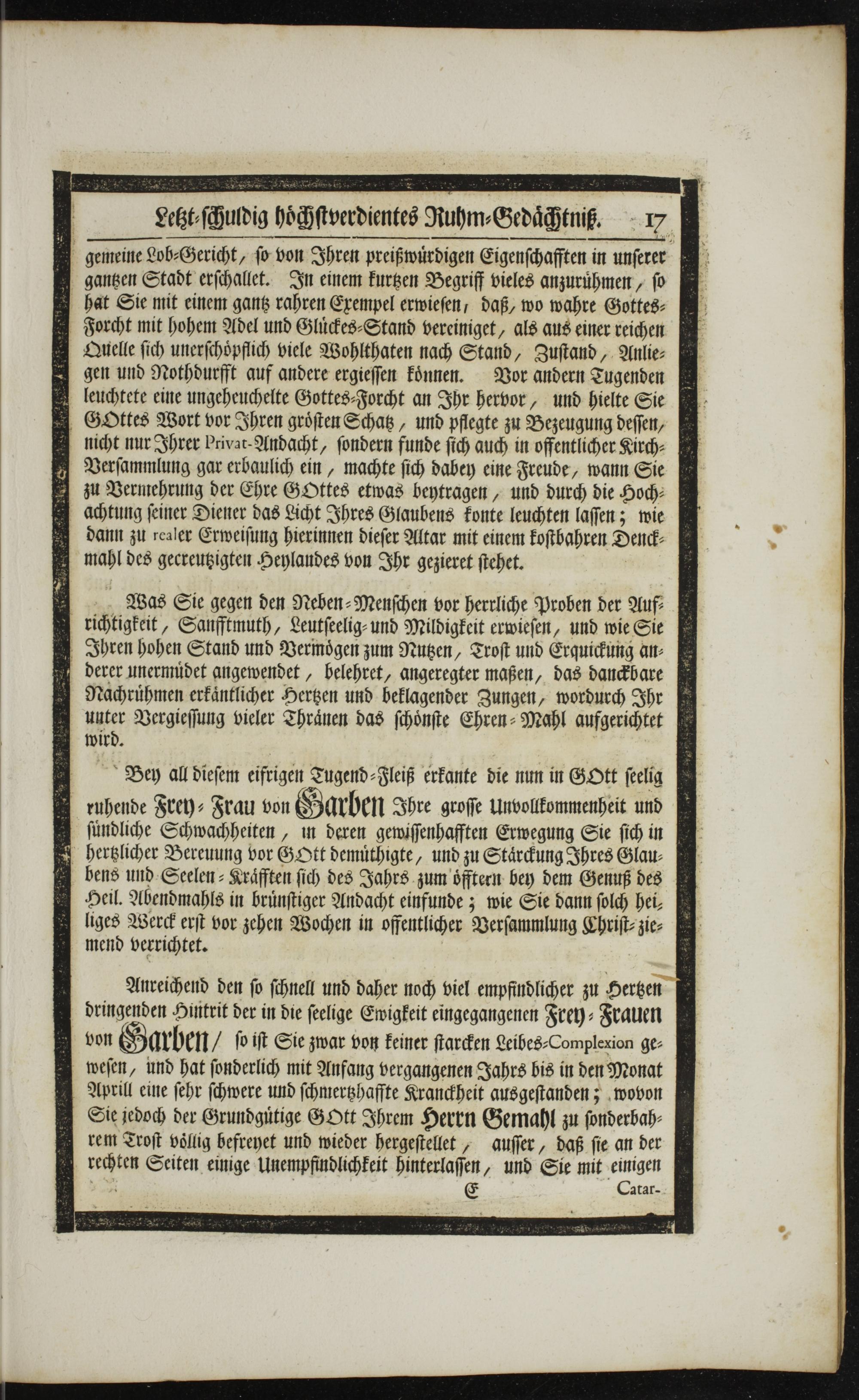 Die Empfehlung glaubiger Seelen gegen Gott : Wurde Bey der solennen Leichen-Begängniß der Weyland Frey-Reichs-Hochwohlgebohrnen Frauen, Frauen Anna Sibylla von Garben, Des Heil. Röm. Reichs-Freyin, auch Edler Frauen von Gibelli, gebohrner Seyfridin, hochseeligen und gesegneten Angedenckens, alls dieselbe im Jahr Christi 1740, Dienstags den 12. Jenner in dem 61ten Jahr ... entrissen ... Einer Hoch-Adelichen, Hoch- und Wohl-Ehrwürdigen und Hochansehnlichen Trauer-Versammlung von dem Altar gehaltenen Trauer-Sermon vorgestellet / von Samuel Widemann, Pfarrer zu St. Ulrich Augsp. Conf.