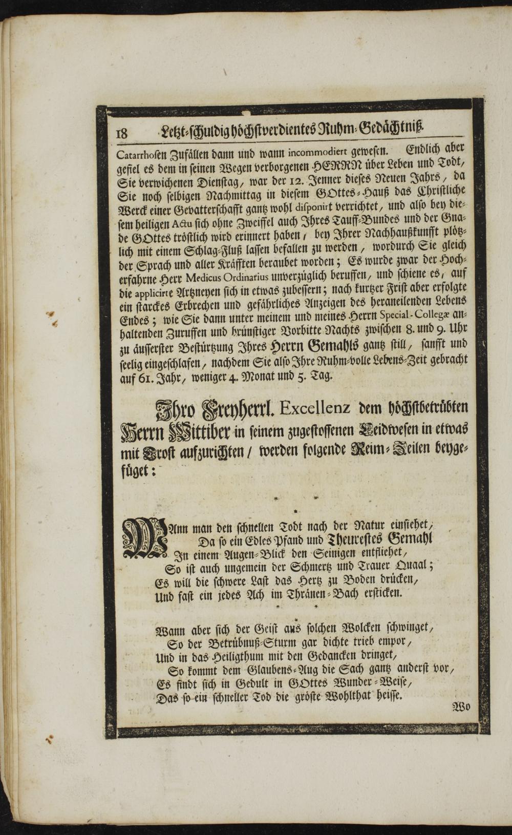 Die Empfehlung glaubiger Seelen gegen Gott : Wurde Bey der solennen Leichen-Begängniß der Weyland Frey-Reichs-Hochwohlgebohrnen Frauen, Frauen Anna Sibylla von Garben, Des Heil. Röm. Reichs-Freyin, auch Edler Frauen von Gibelli, gebohrner Seyfridin, hochseeligen und gesegneten Angedenckens, alls dieselbe im Jahr Christi 1740, Dienstags den 12. Jenner in dem 61ten Jahr ... entrissen ... Einer Hoch-Adelichen, Hoch- und Wohl-Ehrwürdigen und Hochansehnlichen Trauer-Versammlung von dem Altar gehaltenen Trauer-Sermon vorgestellet / von Samuel Widemann, Pfarrer zu St. Ulrich Augsp. Conf.