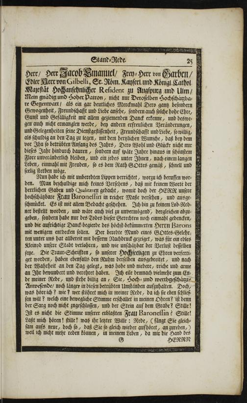 Die Empfehlung glaubiger Seelen gegen Gott : Wurde Bey der solennen Leichen-Begängniß der Weyland Frey-Reichs-Hochwohlgebohrnen Frauen, Frauen Anna Sibylla von Garben, Des Heil. Röm. Reichs-Freyin, auch Edler Frauen von Gibelli, gebohrner Seyfridin, hochseeligen und gesegneten Angedenckens, alls dieselbe im Jahr Christi 1740, Dienstags den 12. Jenner in dem 61ten Jahr ... entrissen ... Einer Hoch-Adelichen, Hoch- und Wohl-Ehrwürdigen und Hochansehnlichen Trauer-Versammlung von dem Altar gehaltenen Trauer-Sermon vorgestellet / von Samuel Widemann, Pfarrer zu St. Ulrich Augsp. Conf.