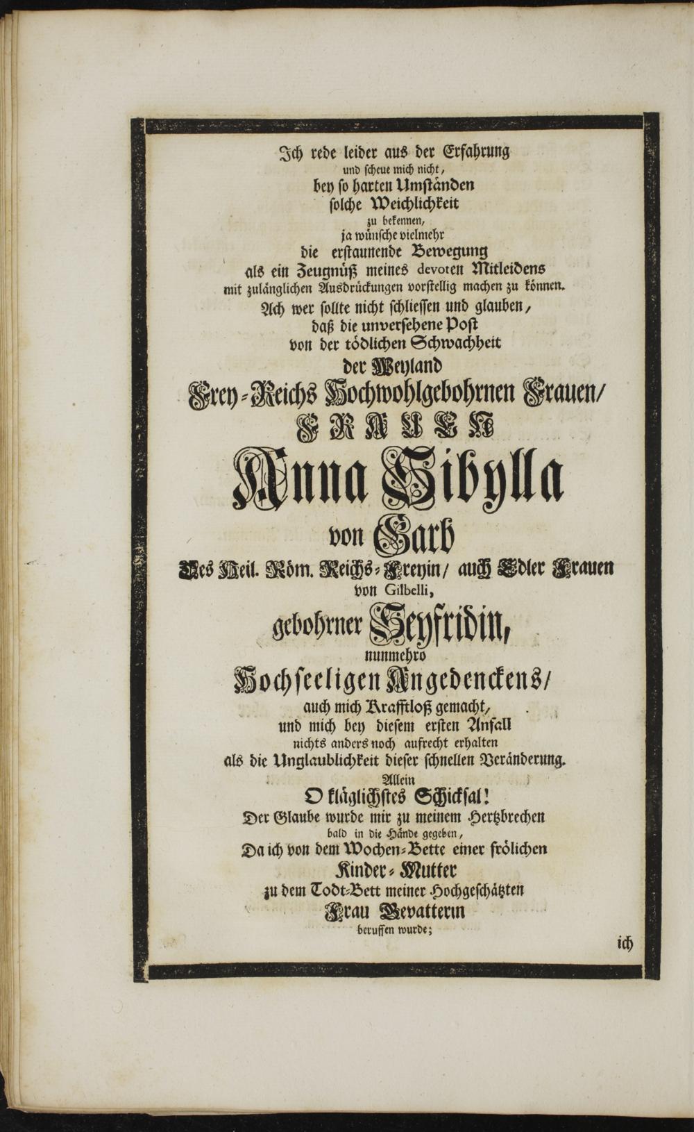 Die Empfehlung glaubiger Seelen gegen Gott : Wurde Bey der solennen Leichen-Begängniß der Weyland Frey-Reichs-Hochwohlgebohrnen Frauen, Frauen Anna Sibylla von Garben, Des Heil. Röm. Reichs-Freyin, auch Edler Frauen von Gibelli, gebohrner Seyfridin, hochseeligen und gesegneten Angedenckens, alls dieselbe im Jahr Christi 1740, Dienstags den 12. Jenner in dem 61ten Jahr ... entrissen ... Einer Hoch-Adelichen, Hoch- und Wohl-Ehrwürdigen und Hochansehnlichen Trauer-Versammlung von dem Altar gehaltenen Trauer-Sermon vorgestellet / von Samuel Widemann, Pfarrer zu St. Ulrich Augsp. Conf.