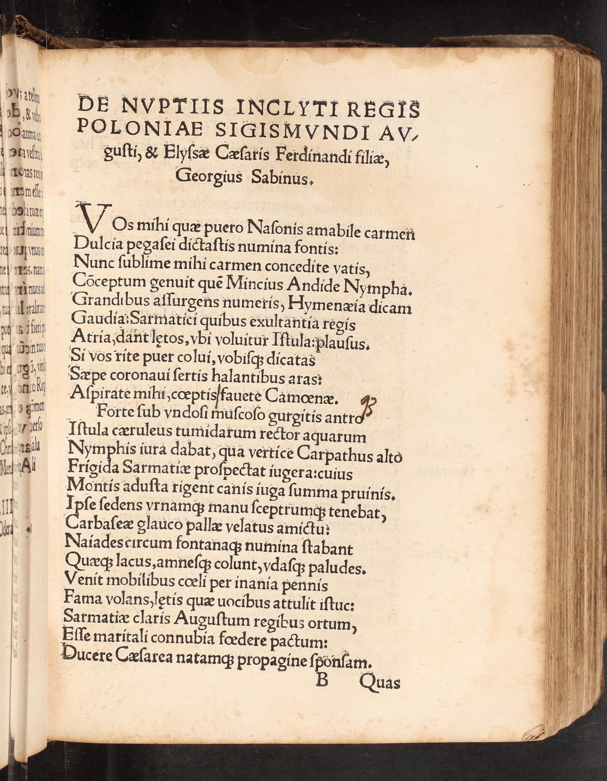 De Nvptiis Inclyti Regis Poloniae Sigismvndi Avgvsti, Et Eyssae Cęsaris Ferdinandi filię, carmen Georgij Sabini, continens pręcipuas omnium Polonicorum Regum historias : Ecloga De Gallo ad Ticinum capto, & aliquot elegię, eiusdem Sabini