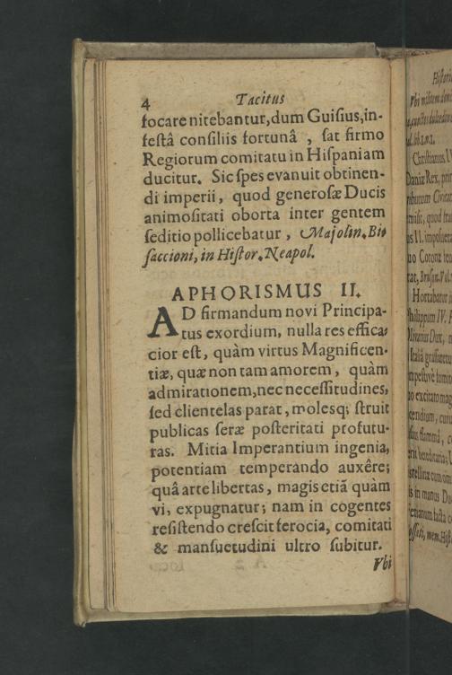 Caroli Moscheni,Anconitani, V.CL. (ut Opusculi fert inscriptio) Tacitus Historiatus , Sive Aphorismi Politici, Taciti Regulis accomodati, ex Idiomate Italico in Latinum transfusi, recentioribusque passim Exemplis Præceptisque illustrati. / Tradente Jacobo Le-Blev , V.I.D. & P.P.
