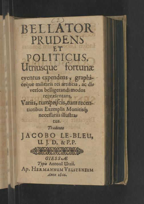Bellator Prudens Et Politicus, : Utriusque fortunæ eventus expendens, graphiceque militaris rei artificia, ac diversos belligerandi modos repræsentans, Variis, tum priscis, tum recentioribus Exemplis Monitisq́; necessariis illustratus / Galeazzo Gualdo Priorato ; Tradente Jacobo Le-Bleu, U.J.D. & P.P.