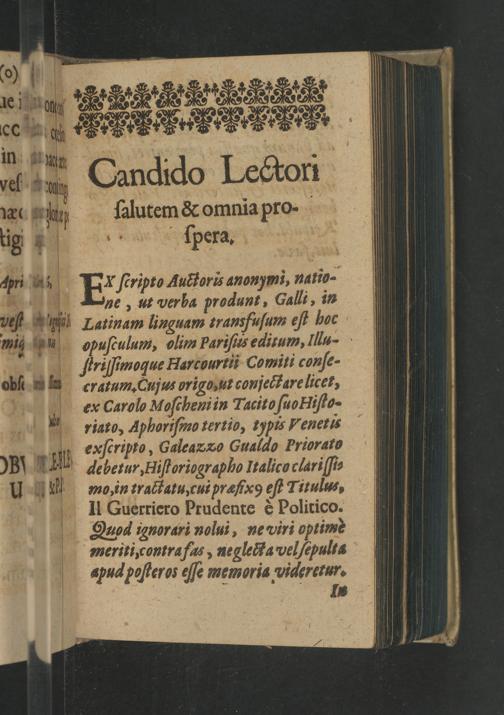 Bellator Prudens Et Politicus, : Utriusque fortunæ eventus expendens, graphiceque militaris rei artificia, ac diversos belligerandi modos repræsentans, Variis, tum priscis, tum recentioribus Exemplis Monitisq́; necessariis illustratus / Galeazzo Gualdo Priorato ; Tradente Jacobo Le-Bleu, U.J.D. & P.P.