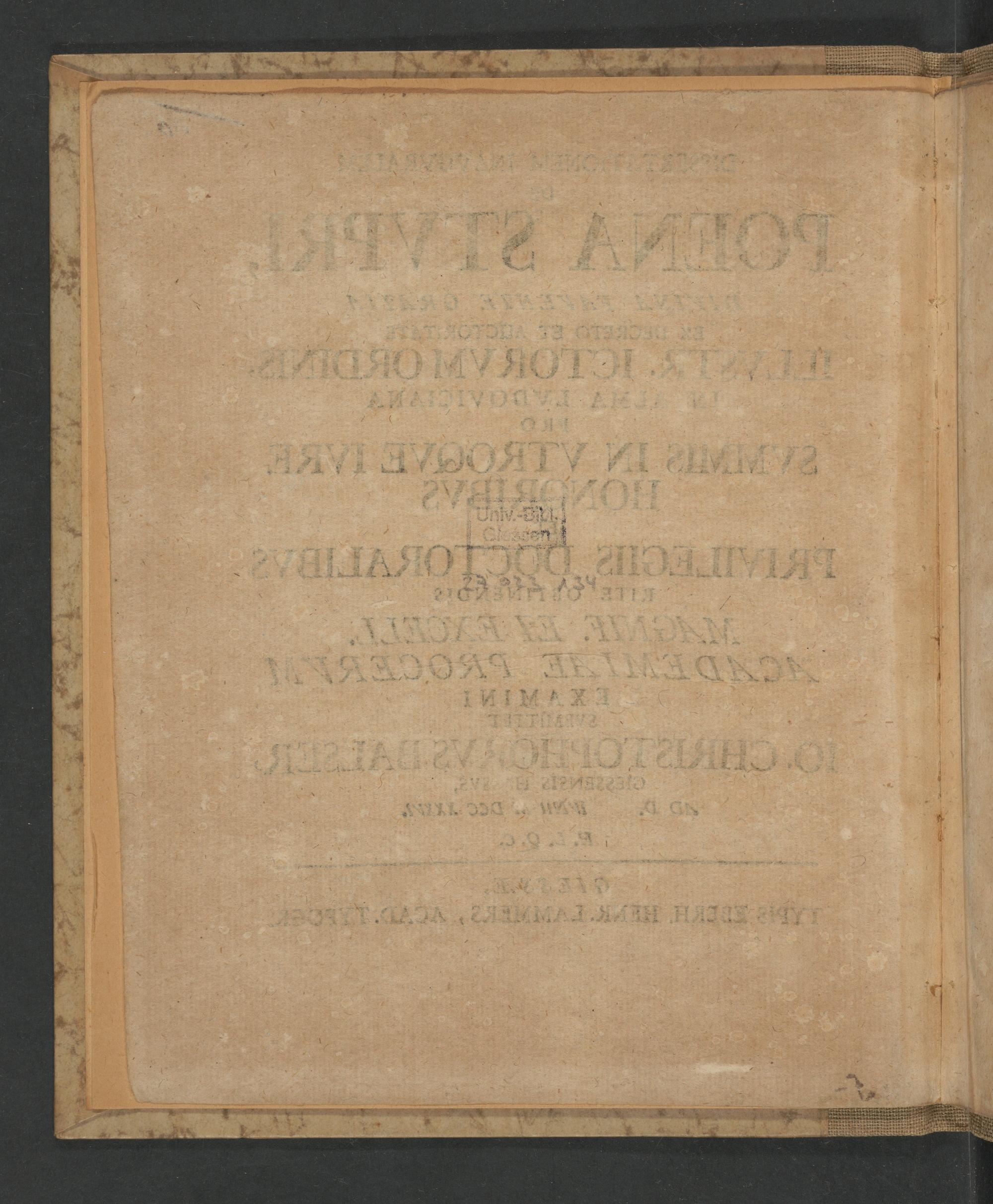 Dissertationem Inavgvralem De Poena Stupri, Divina Facente Gratia Ex Decreto Et Auctoritate Pro Svmmis in Vtroqve Ivre Honoribvs Et Privilegiis Doctoralibvs Rite Obtinendis : Magnif. Et Excell. Academiae Procervm Examini / Svbmittet Io. Christophorvs Balser, Giessensis Hassvs
