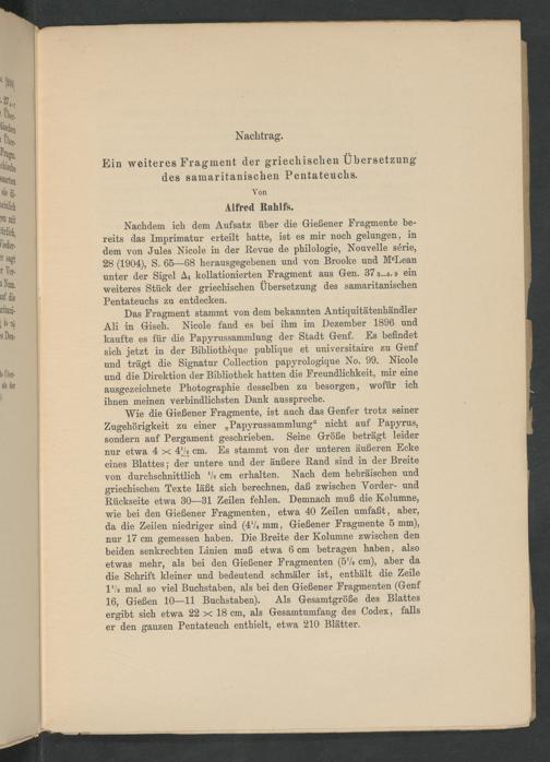 Fragmente einer griechischen Übersetzung des samaritanischen Pentateuchs. / von Paul Glaue und Alfred Rahlfs