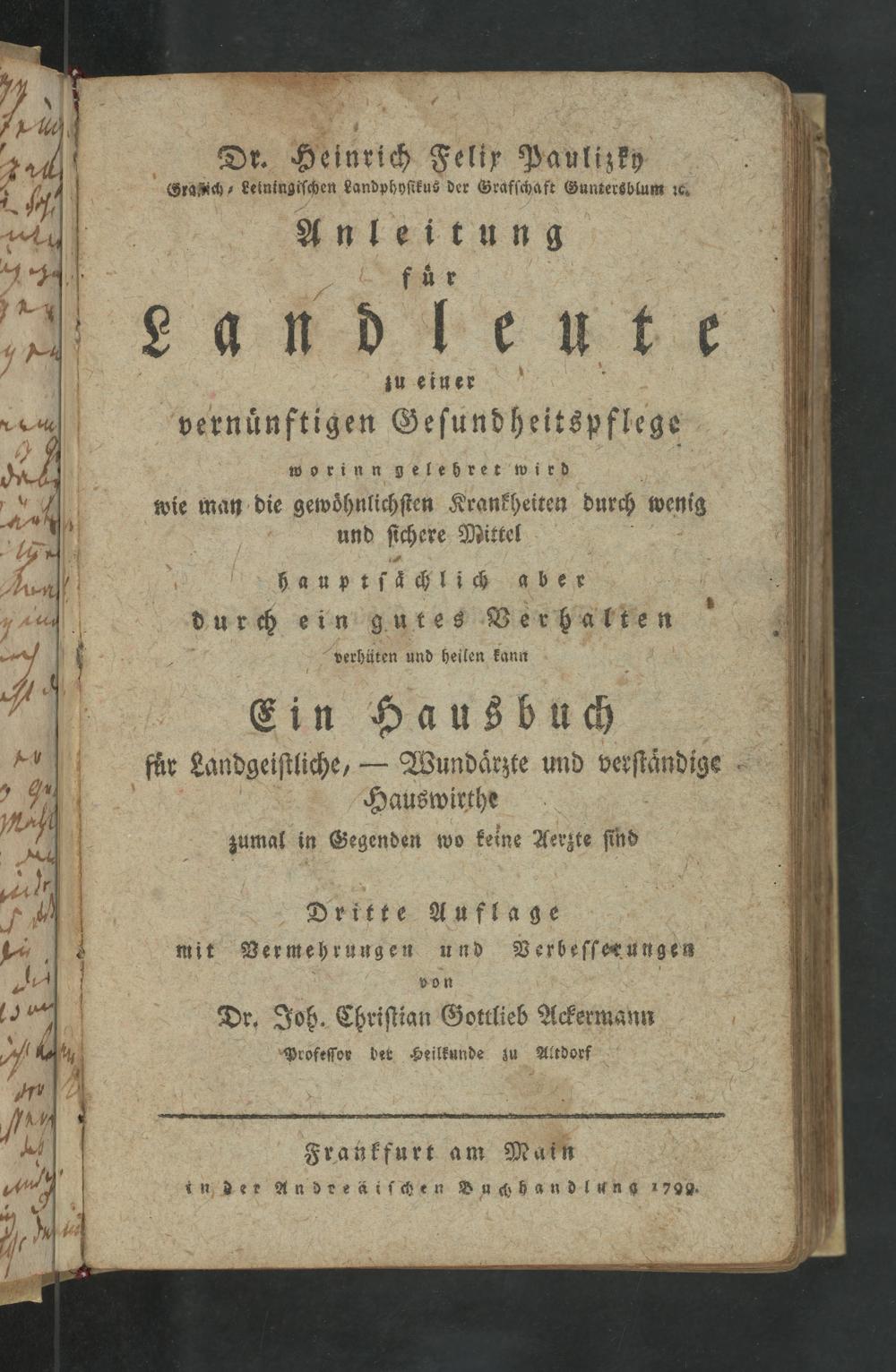 Anleitung für Landleute zu einer vernünftigen Gesundheitspflege worinn gelehret wird wie man die gewöhnlichsten Krankheiten durch wenig und sichere Mittel hauptsächlich aber durch ein gutes Verhalten verhüten und heilen kann : Ein Hausbuch für Landgeistliche, - Wundärzte und verständige Hauswirthe zumal in Gegenden wo keine Aertze sind / Dr. Heinrich Felix Paulitzky Gräflich-Leiningischen Landphysikus der Grafschaft Guntersblum [et]c.