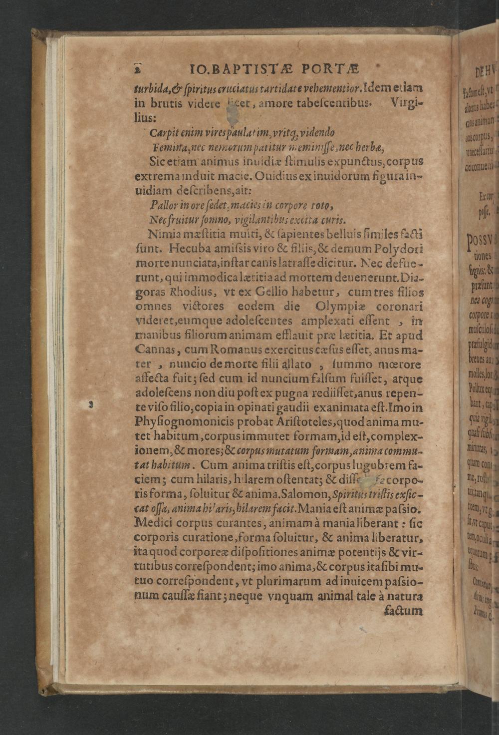 De Hvmana Physiognomonia Joannis Baptistæ Portæ Neapolitani. Libri IV : Qvi ab extimis, quæ in hominum corporibus conspiciuntur signis, ita eorum naturas, mores & consilia (egregijs ad viuum expressis Iconibvs) demonstrant, vt intimos animi recessus penetrare videantur : Omnibus omnium ordinum studiosis lectu utiles, maximeque iucundi : Cum dublici Rerum & Verborum Indice longè locupletißimo. / Ioannis Baptistæ Portæ Neapolitani