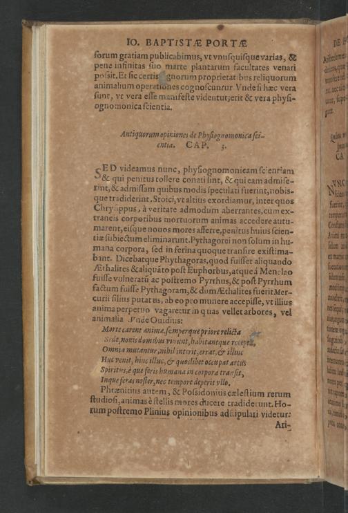 De Hvmana Physiognomonia Joannis Baptistæ Portæ Neapolitani. Libri IV : Qvi ab extimis, quæ in hominum corporibus conspiciuntur signis, ita eorum naturas, mores & consilia (egregijs ad viuum expressis Iconibvs) demonstrant, vt intimos animi recessus penetrare videantur : Omnibus omnium ordinum studiosis lectu utiles, maximeque iucundi : Cum dublici Rerum & Verborum Indice longè locupletißimo. / Ioannis Baptistæ Portæ Neapolitani