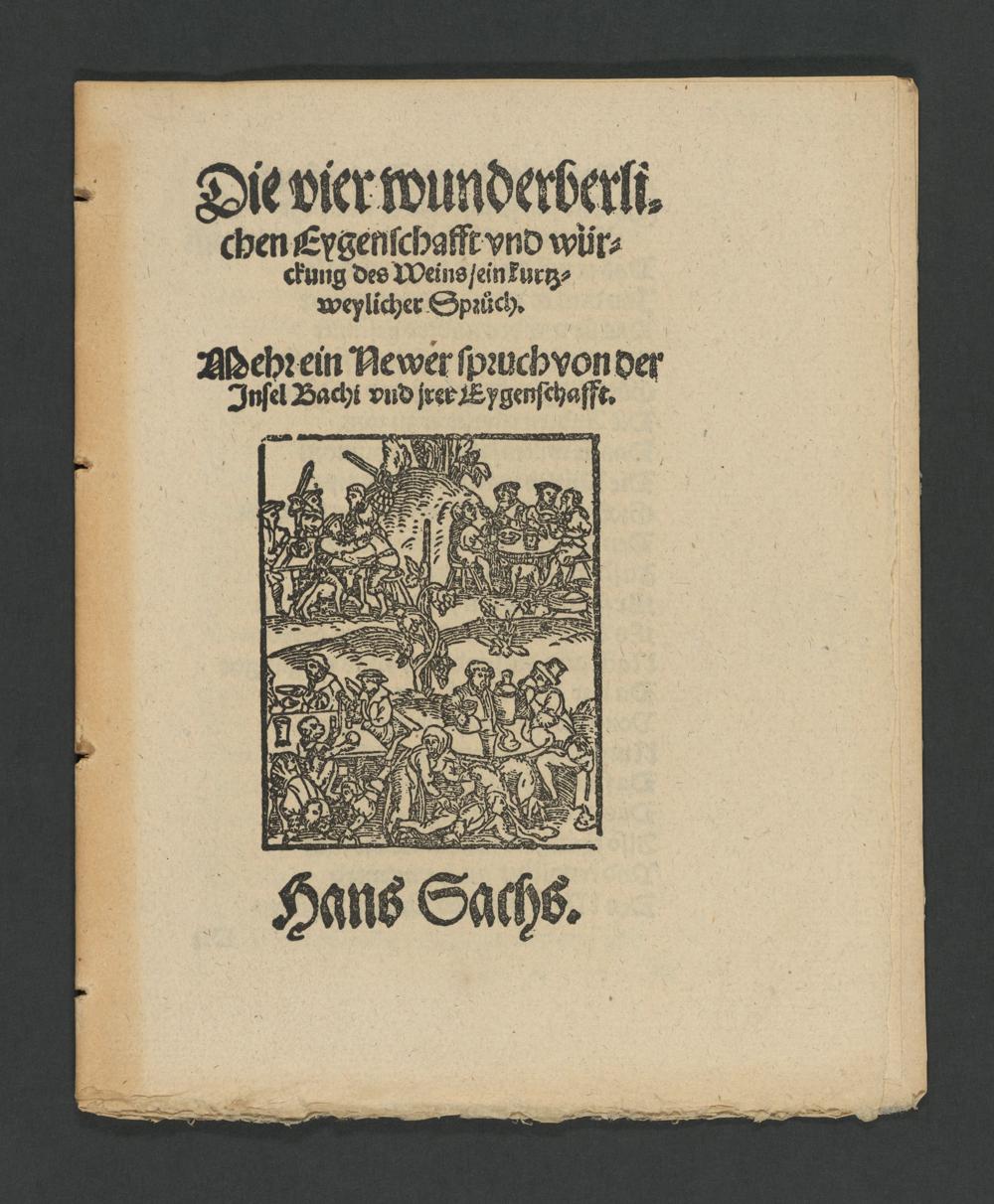 Die vier wunderberlichen Eygenschafft vnd würckung des Weins/ ein kurtzweylicher Sprůch. : Mehr ein Newer spruch von der Jnsel Bachi vnd jrer Eygenschafft. / Hans Sachs.