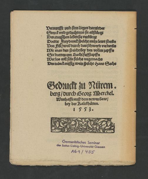 Die vier wunderberlichen Eygenschafft vnd würckung des Weins/ ein kurtzweylicher Sprůch. : Mehr ein Newer spruch von der Jnsel Bachi vnd jrer Eygenschafft. / Hans Sachs.