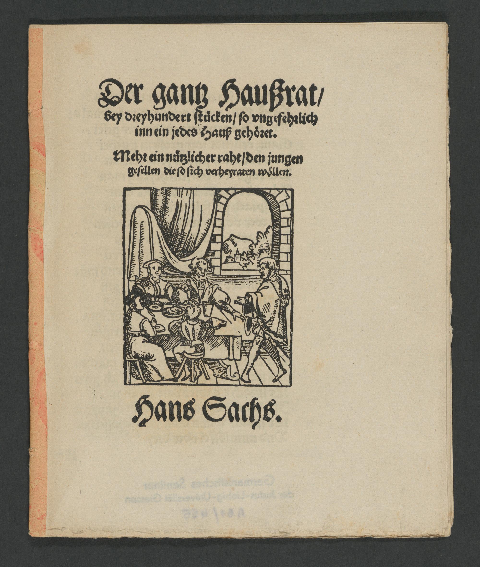 Der gantz Haußrat/ bey dreyhundert stücken/ so vngefehrlich inn ein jedes Hauß gehöret. Mehr ein nützlicher raht/ den jungen gesellen die so sich verheyraten wöllen. / Hans Sachs.
