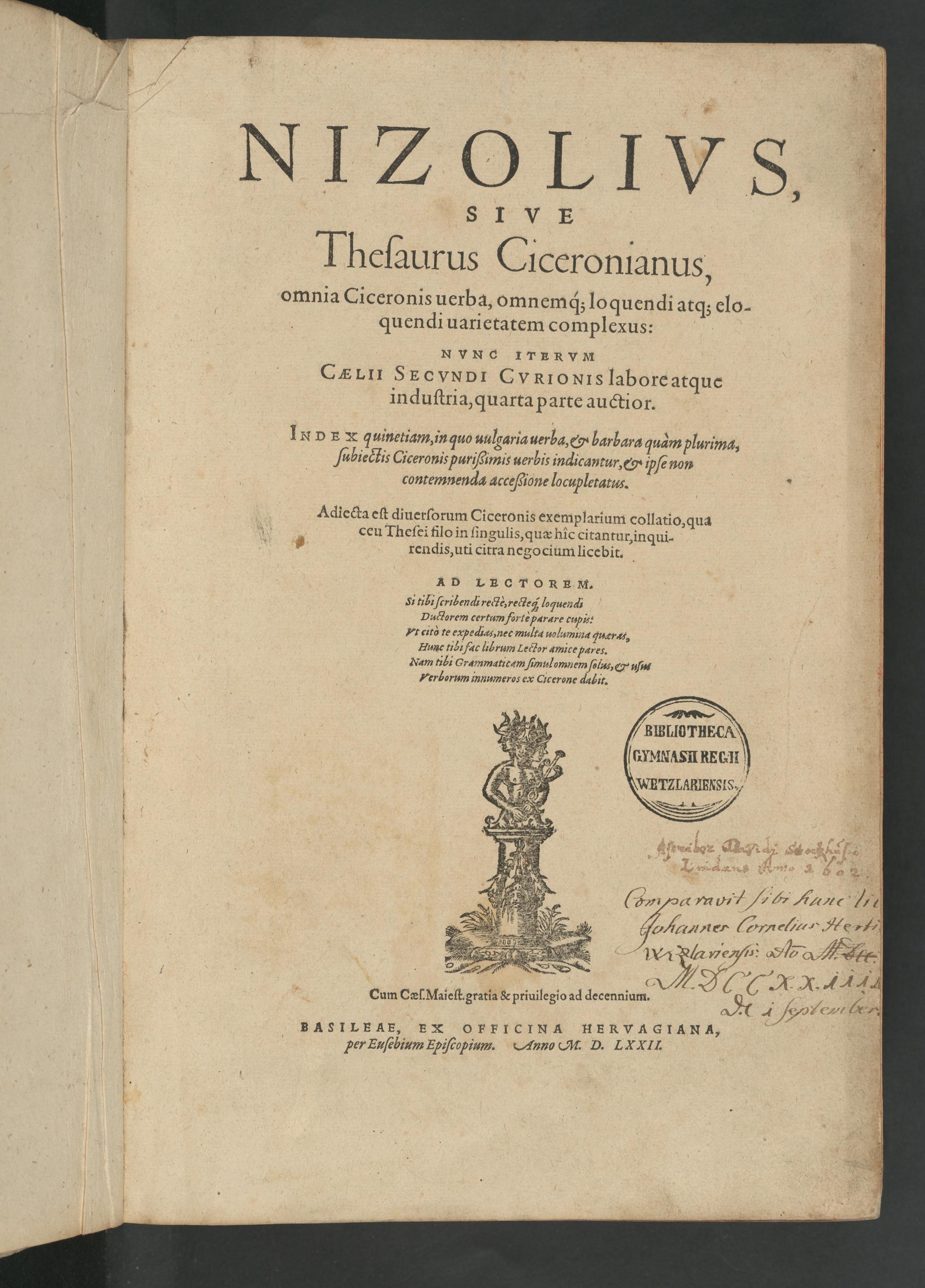 Nizolivs Sive Thesaurus Ciceronianus : omnia Ciceronis verba, omnemque loquendi atque eloquendi varietatem complexus ....