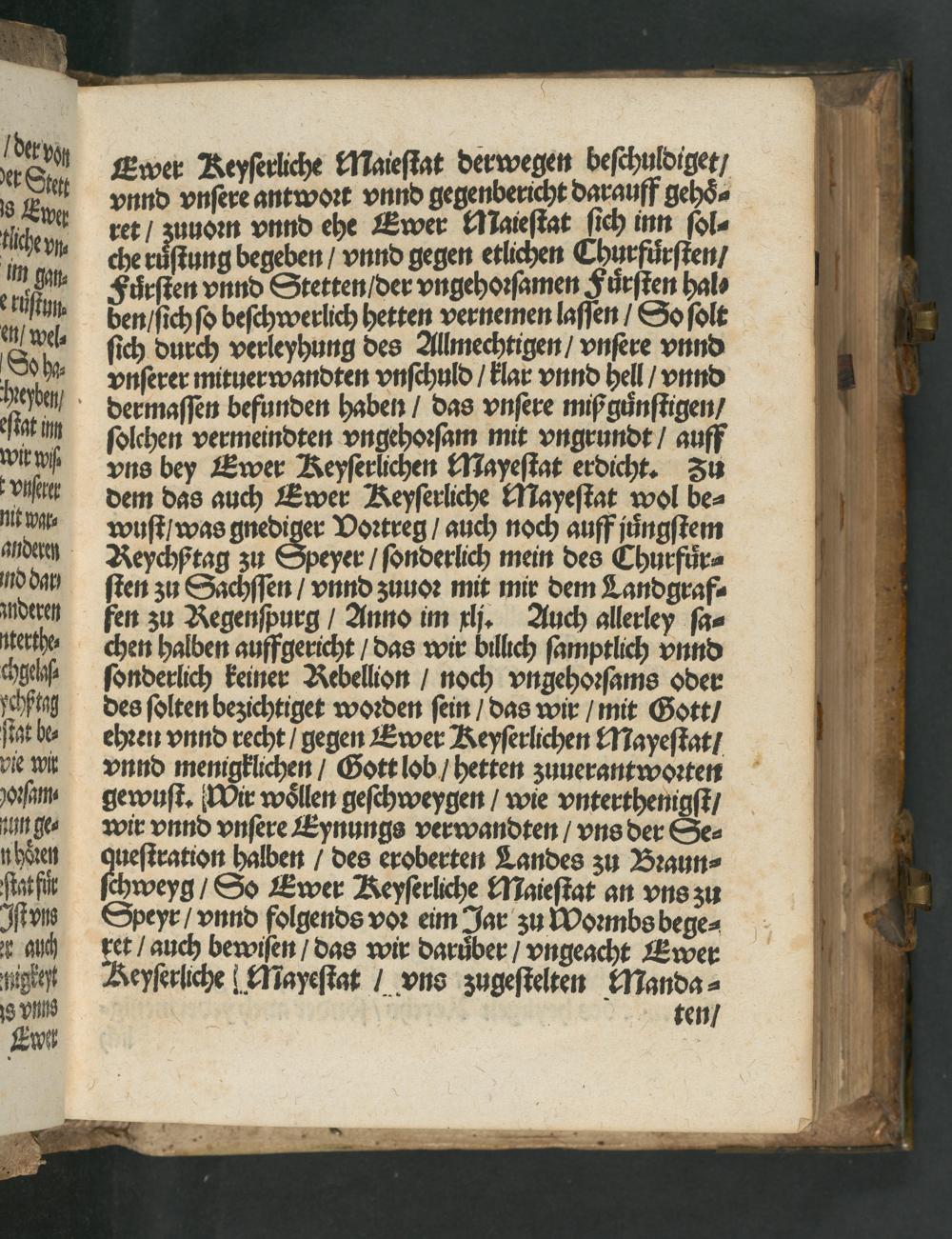 Der Durchleuchtigst vnd Durchleuchtigen Hochgebornen Fürsten vnd Herrn, Herrn, Johans Friderichen Hertzogen zu Sachssen ... Vnd Herrn Philipsen Landgrauen zu Hessen ... Warhafftiger bericht vnd Summari außführung, Warumb jnen zu vnschulden auffgelegt wirdet, Das sie Römischer Key. May. vngehorsame Fürsten sein solten, Das sie auch keins strefflichen vngehorsams geziegen mögen werden, anders, dan[n] das sie von vnserm waren heiligen Christlichen Glauben, vnnd von Gottes wort, vnd der reinen lehr des heiligen Euangelij, nit können abstehen, Noch die selb dem Römischen Antichrist dem Bapst vnd seinem partheischen Trientischen Concilio zurichten vnterwerffen ...