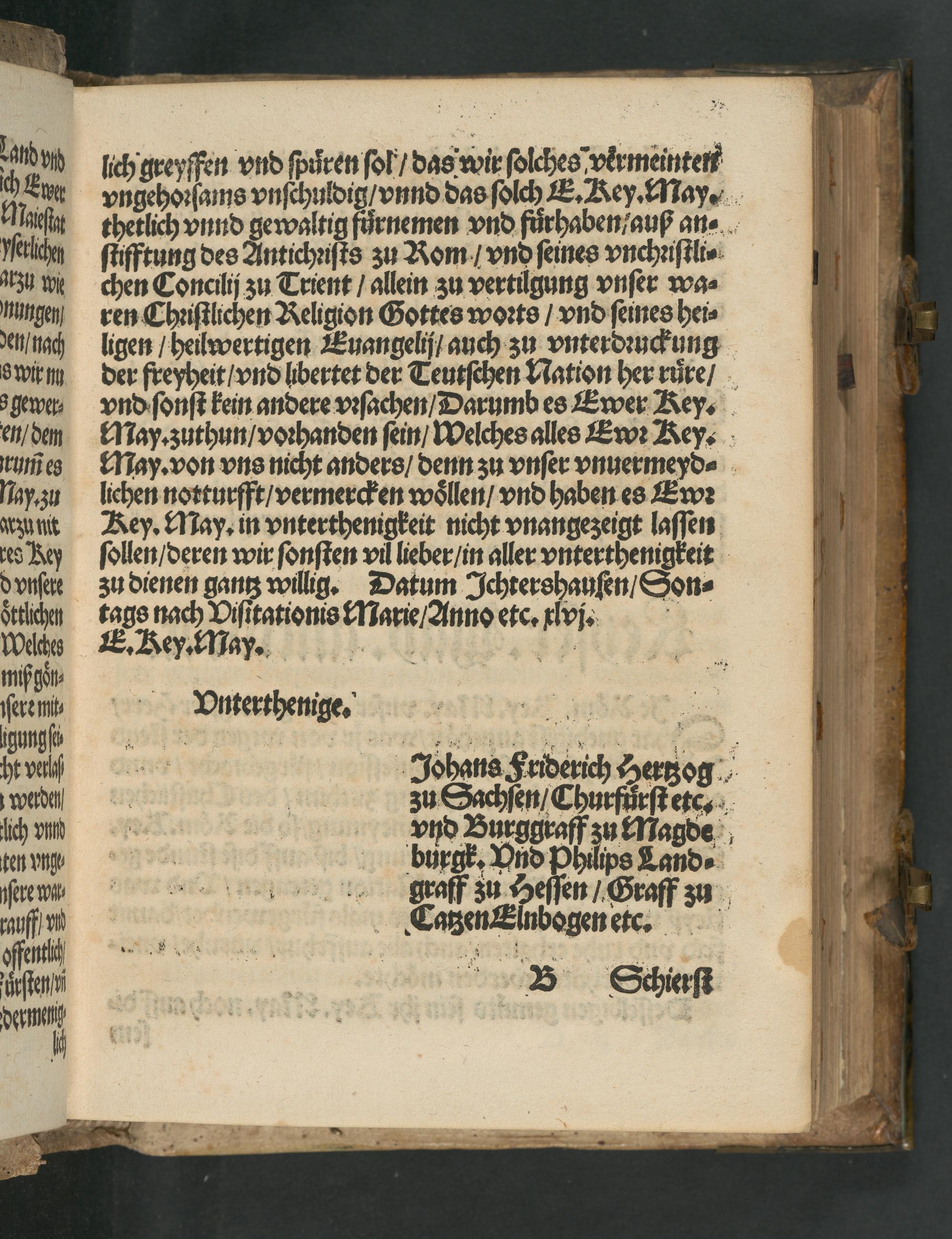 Der Durchleuchtigst vnd Durchleuchtigen Hochgebornen Fürsten vnd Herrn, Herrn, Johans Friderichen Hertzogen zu Sachssen ... Vnd Herrn Philipsen Landgrauen zu Hessen ... Warhafftiger bericht vnd Summari außführung, Warumb jnen zu vnschulden auffgelegt wirdet, Das sie Römischer Key. May. vngehorsame Fürsten sein solten, Das sie auch keins strefflichen vngehorsams geziegen mögen werden, anders, dan[n] das sie von vnserm waren heiligen Christlichen Glauben, vnnd von Gottes wort, vnd der reinen lehr des heiligen Euangelij, nit können abstehen, Noch die selb dem Römischen Antichrist dem Bapst vnd seinem partheischen Trientischen Concilio zurichten vnterwerffen ...
