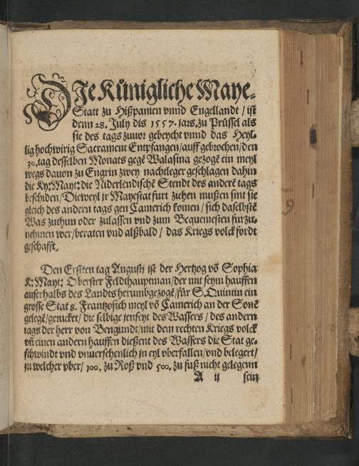 Newe zeytung. Warhafftiger und grundlicher bericht der Schlacht so geschehen ist zwischen dem/ Künig von Hisspanien vnd Engellandt/ eins theyls/ vnnd darnach zwischen dem Künig auß Franckreych des andern theyls/ vor S. Quintin jn Picardia den x. tag A[ue]gusty in diesem M.D.Lvii. Jar gescheheu.