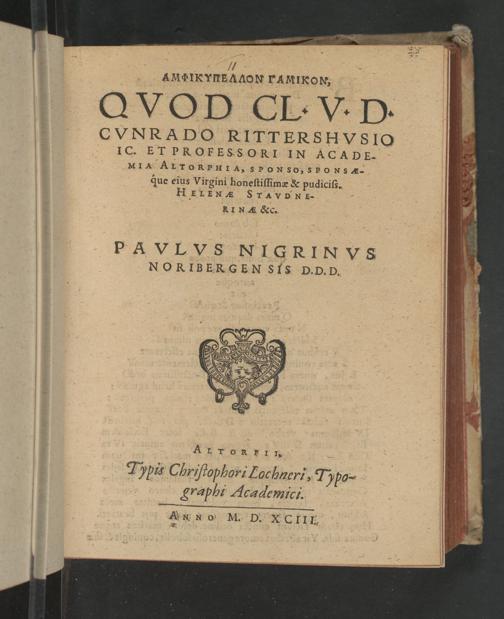 Amphikypellon gamikon, quod CLV D. Cunrado Rittershusio IC. et Professori IC. Academia Altdorphia, sponso, sponsaequae eius Virgini .. Helenae Staudnerinae etc. / Paulus Nigrinus Nori bergensis D.D.D.