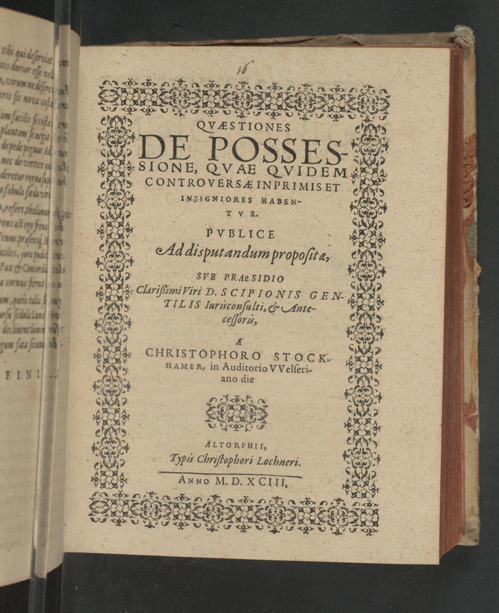 Quæstiones De Possessione, Qvæ Qvidem Controversæ Inprimis Et Insigniores Habentvr / Pvblice Ad disputandum propositae Svb Praesidio Clarißimi Viri D. Scipionis Gentilis Iurisconculti, & Antecessoris, A Christophoro Stockhamer, in Auditorio Vvelseriano die