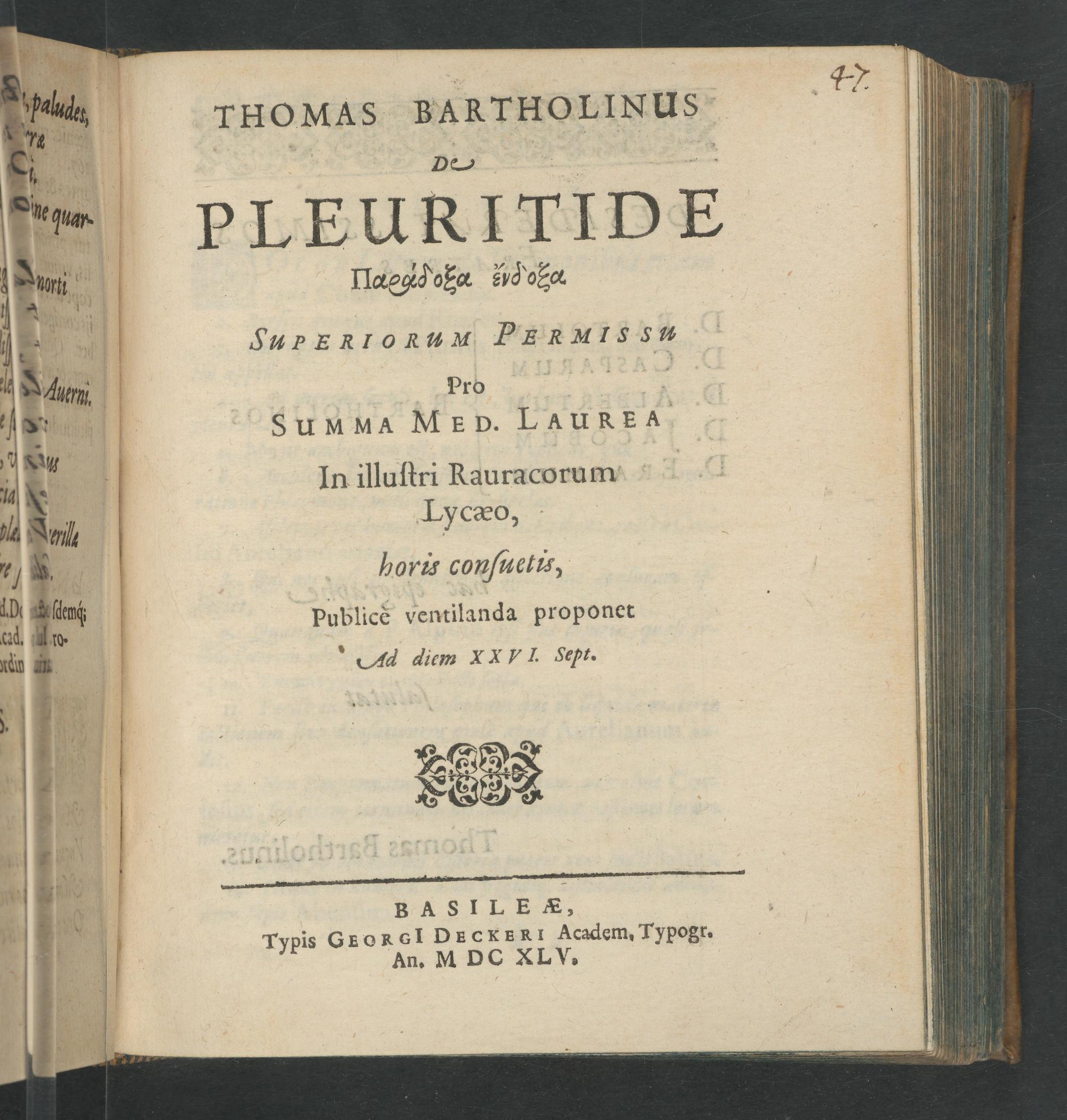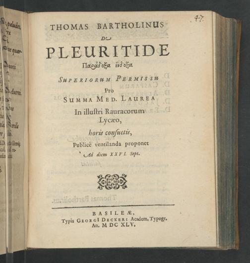 Thomas Bartholinus De Pleuritide Paradoxa endoxa : Superiorum Permissu Pro Summa Med. Laurea In illustri Rauracorum Lycæo, horis consuetis, Publice ventilanda proponet Ad diem XXVI. Sept.
