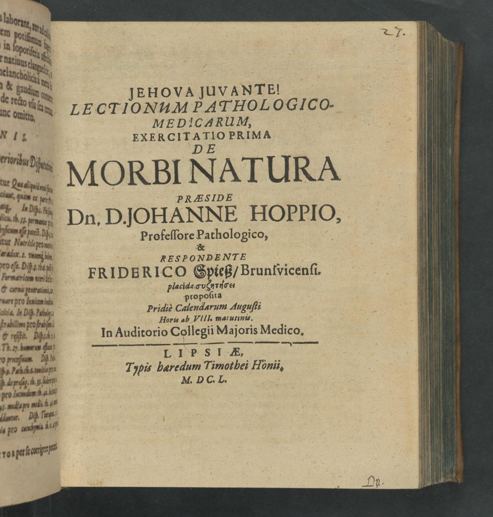 Lectionum Pathologico-Medicarum, Exercitatorum, Exercitatio Prima De Morbi Natura / Præside Dn. D. Johanne Hoppio, Professore Pathologico ; & Respondente Friderico Spieß Brunsvicensi placide syzētēsei proposita Pridiè Calendarum Augusti Horis ab VIII. matutinis. In Auditorio Collegii Majoris Medico