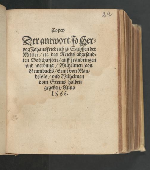 Copey Der Antwort, so Hertzog Johansfriedrich zu Sachssen, der Mittler, etc., des Reichs abgesandten Botschaften, auff jr anbrigen vnd werbung, Wilhelmen von Grumbachs, Ernst von Mandelslo, vnd Wilhelmen vom Steins halben gegeben, Anno 1566