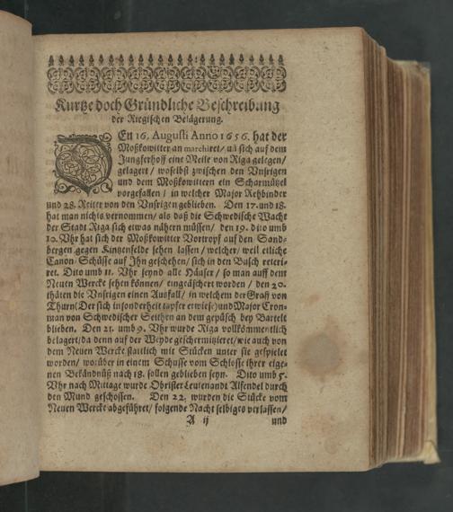 Eigentliche Beschreibung Wie Die Königl. Schwedische HauptStadt Riga in Liefflandt, Von dem Moßkowitter sieben Wochen lang vergebens belägert worden : Auch ist hierinnen zubefinden was sich von tag zu tag seither der gantzen Belägerung inn- und ausserhalb der Stadt begeben und zugetragen