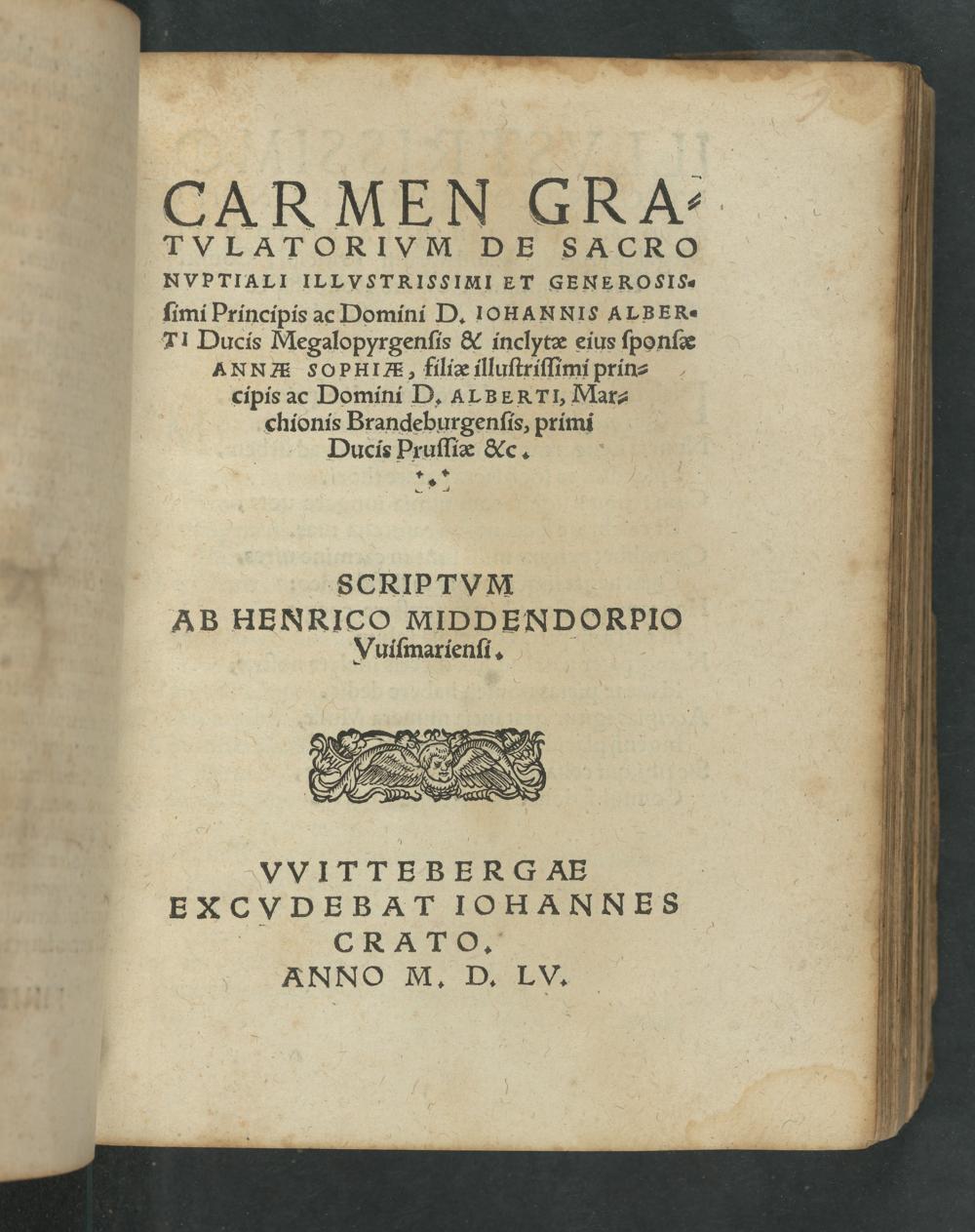 Carmen Gratvlatorivm De Sacro Nvptiali Illvstrissimi Et Generosissimi Principis ac Domini D. Iohannis Alberti Ducis Megalopyrgensis & inclytæ eius sponsæ Annæ Sophiæ, filiæ illustrissimi Marchionis Brandeburgensis, primi Ducis Prussiæ &c. / Scriptvm Ab Henrico Middendorpio Vuismeriensi