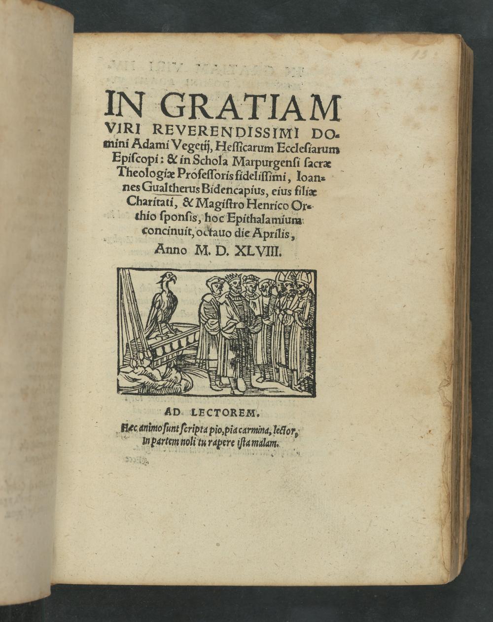 In Gratiam Viri Reverendissimi Domini Adami Vegetij, Hessicarum Ecclesiarum Episcopi: & in Schola Marpurgensi sacræ Theologiæ Professoris fidelissimi, Ioannes Gualtherus Bidencapius, eius filiæ Charitati, & Magistro Henrico Orthio sponsis, hoc Epithalamium concinuit, octauo die Aprilis, Anno M.D.XLVIII.