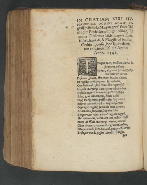 In Gratiam Viri Reverendissimi Domini Adami Vegetij, Hessicarum Ecclesiarum Episcopi: & in Schola Marpurgensi sacræ Theologiæ Professoris fidelissimi, Ioannes Gualtherus Bidencapius, eius filiæ Charitati, & Magistro Henrico Orthio sponsis, hoc Epithalamium concinuit, octauo die Aprilis, Anno M.D.XLVIII.