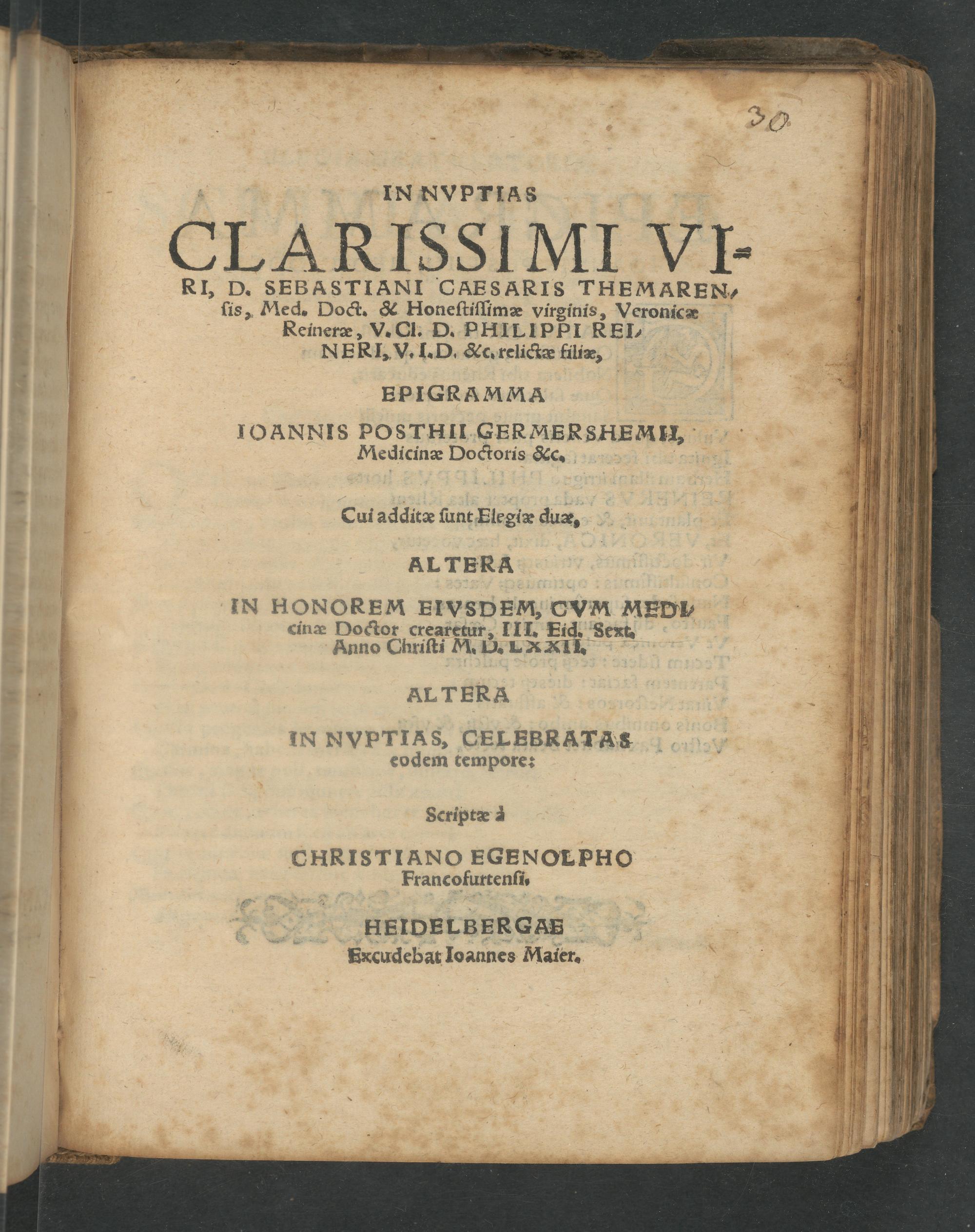 In Nvptias Clarissimi Viri, D. Sebastiani Caesaris Themarensis, Med. Doct. & Honestissimæ virginis, Veronicæ Reineræ, V. Cl. D. Philippi Reineri, V.I.D. &c. relictæ filiæ : Epigramma Ioannis Posthii Germershemii, Medicinæ Doctoris &c.