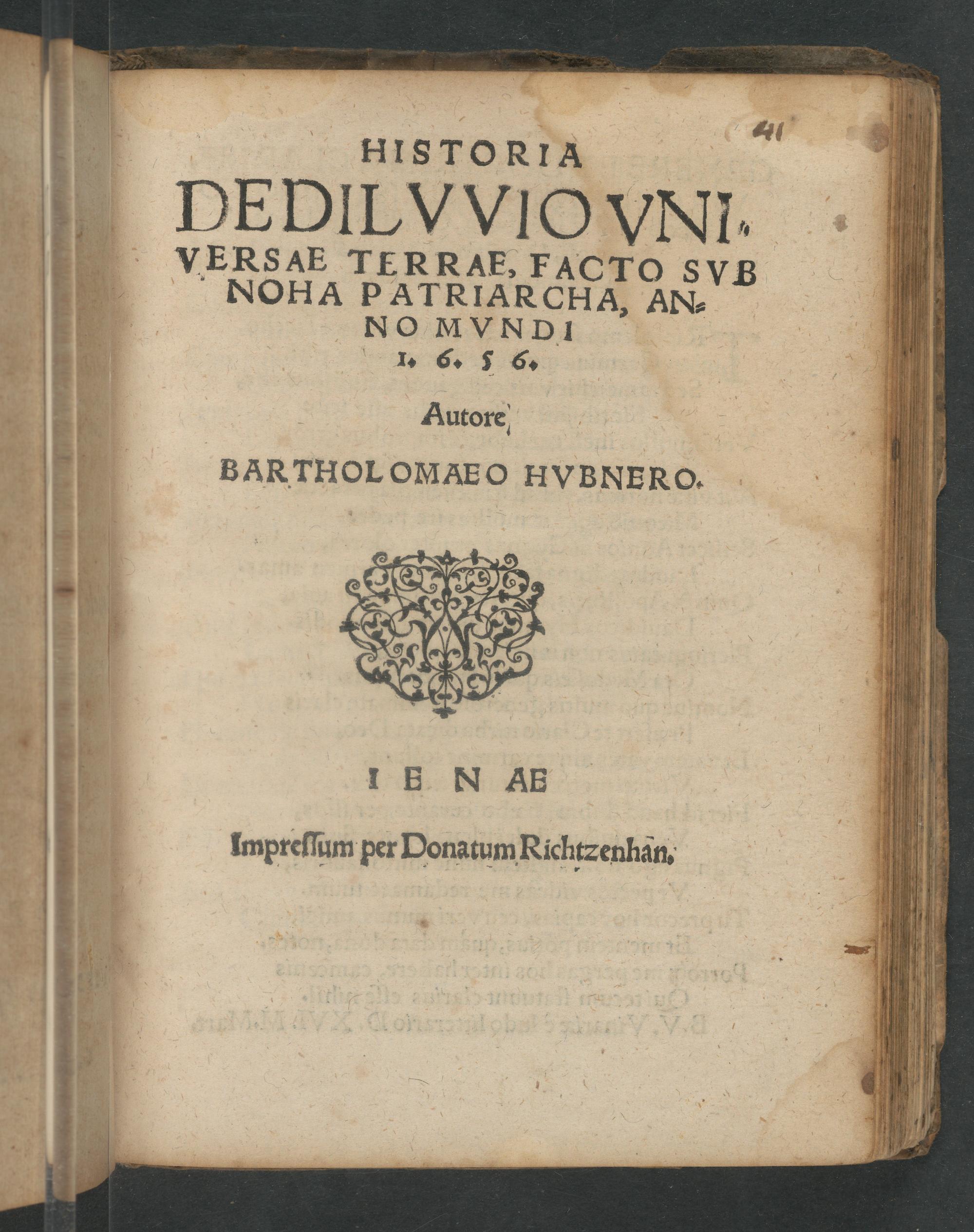 Historia Dedilvvio Vniversae Terrae : Facto Svb Noha Patriarcha, Anno Mundi 1.6.56. / Authore Bartholomaeo Hvbnero
