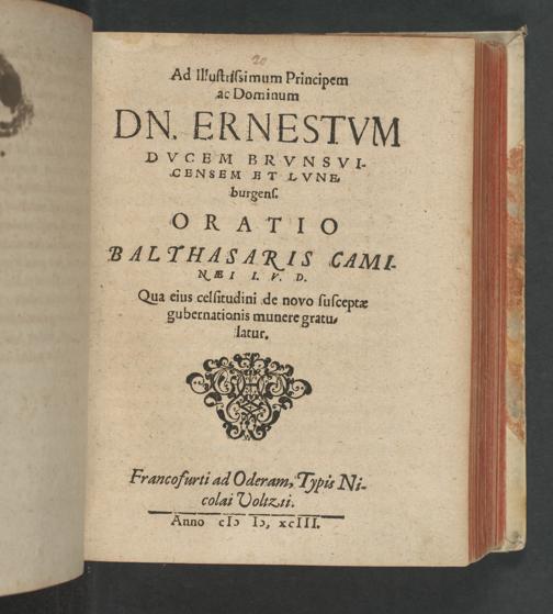 Ad illustrissimum principem ac dominum, Dn. Ernestum ducem Brunsvicensem et Luneburgens. oratio Balthasaris Caminaei I.U.D. qua eius celsitudini de novo susceptae gubernationis munere gratulatur