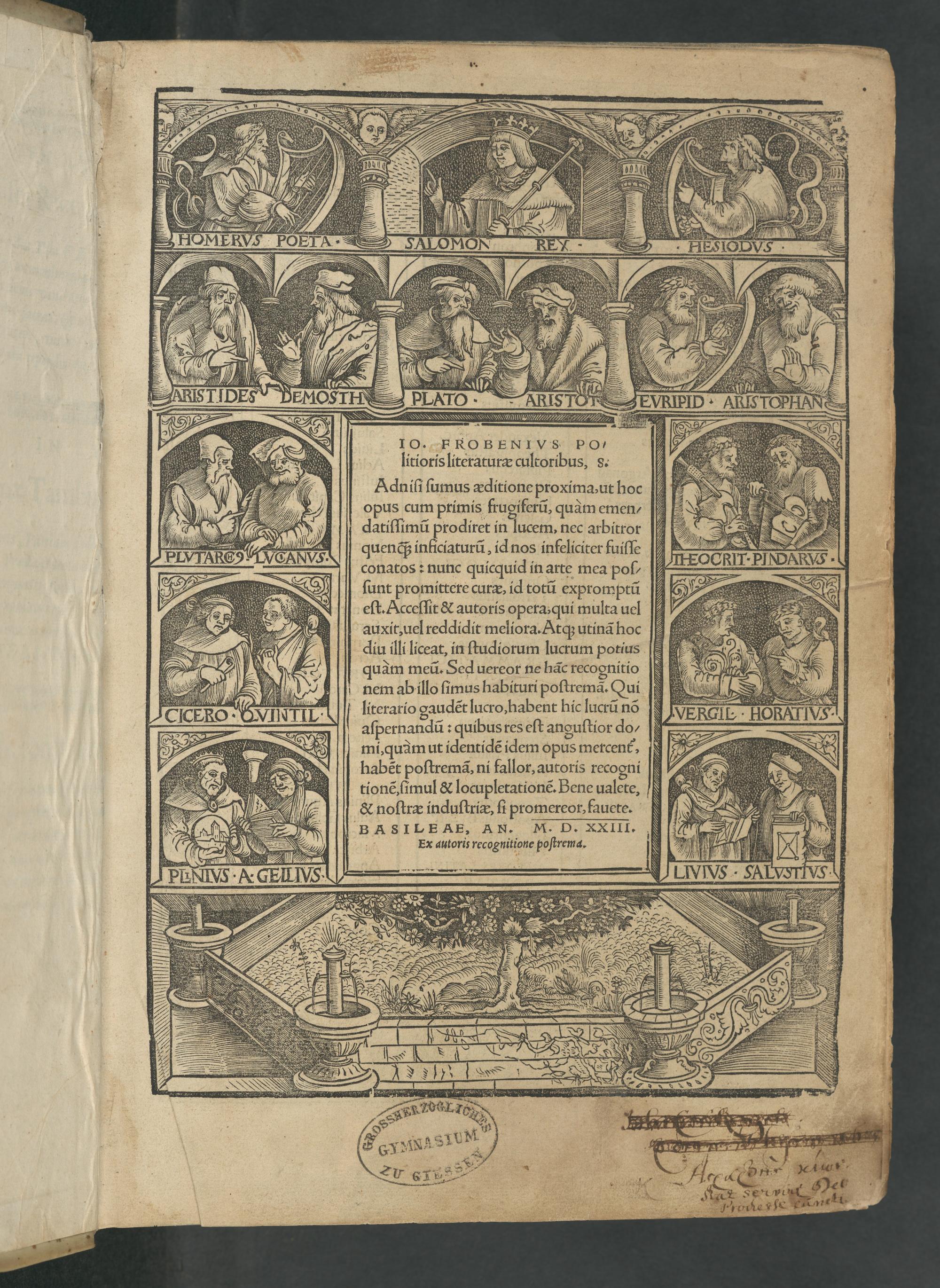 Io. Frobenivs Politioris literaturæ cultoribus, s. : Adnisi sumus æditione proxima, ut hoc opus cum primis frugiferu[m], quàm emendatissimu[m] prodiret in lucem, nec arbiror quenq[ue] inficiaturu[m], id nos infeliciter fuisse conatos : nunc quicquid in arte mea possunt promittere curæ, it totu[m] expromtu[m] est : Accessit & autoris opera, qui multa uel auxit, uel reddidit meliora : Atq[que] utina[m] hoc diu illi liceat, in studiorum lucrum potius quàm meu[m]: Sed uercor ne ha[n]c recognitio nem ab illo simus habituri postrema[m] : qui literario gaude[n]t lucro, habent hic lucru[m] no[n] aspernandu[m] : quibus res est angustior domi, quam ut identide[m] idem opus mercent, habet postrema[m], ni fallor, autoris recogni tione[m], simul & locupletatione[m] : Bene ualete, & nostræ industriæ, si promereor, fauete / [Erasmvs Roterodamvs]