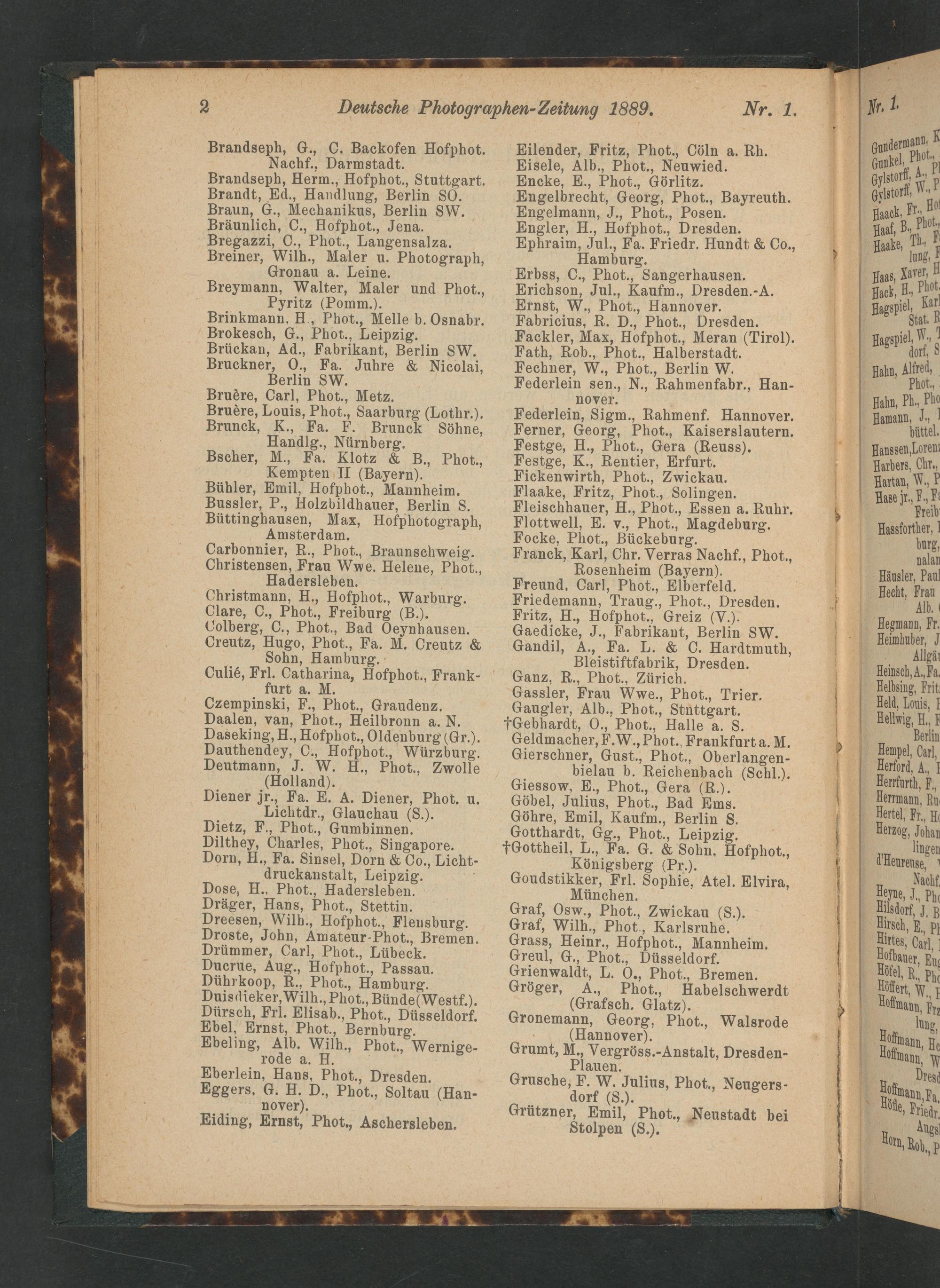 Brandseph, G., C. Backofen Hofphot. Nachf., Darmstadt. Brandseph, Herm., Hofphot., Stuttgart. Brandt, Ed., Handlung, Berlin 80. Braun, G., Mechanikus, Berlin SW. Bräunlich, C., Hofphot., Jena. Bregazzi, C., Phot., Langensalza. Breiner, Wilh., Maler u. Photograph, Gronau a. Leine. Breymann, Walter, Maler und Phot., Pyritz(Pomm.). Brinkmann. H., Phot., Melle b. Osnabr. Brokesch, G., Phot., Leipzig. Brückan, Ad., Fabrikant, Berlin SW. Bruckner, O., Fa. Juhre& Nicolai, Berlin SW. Bruère, Carl, Phot., Metz. Bruère, Louis, Phot., Saarburg(Lothr.). Brunck, K., Fa. F. Brunck Söhne, Handlg., Nürnberg. Bscher, M., Fa. Klotz& B., Phot., Kempten II(Bayern). Bühler, Emil, Hofphot., Mannheim. Bussler, P., Holzbildhauer, Berlin S. Büttinghausen, Max, Hofphotograph, Amsterdam. Carbonnier, R., Phot., Braunschweig. Christensen, Frau Wwe. Helene, Phot., Hadersleben. Christmann, H., Hofphot., Warburg. Clare, C., Phot., Freiburg(B.). Colberg, C., Phot., Bad Oeynhausen. Creutz, Hugo, Phot., Fa. M. Creutz& Sohn, Hamburg. Culié, Frl. Catharina, Hofphot., Frank- furt a. M. Czempinski, F., Phot., Graudenz. Daalen, van, Phot., Heilbronn a. N. Daseking, H., Hofphot., Oldenburg(Gr.). Dauthendey, C., Hofphot., Würzburg. Deutmann, J. W. H., Phot., Zwolle (Holland). Diener jr., Fa. E. A. Diener, Phot. u. Lichtdr., Glauchau(S.). Dietz, F., Phot., Gumbinnen. Dilthey, Charles, Phot., Singapore. Dorn, H., Fa. Sinsel, Dorn& Oo., Licht- druckanstalt, Leipzig. Dose, H., Phot., Hadersleben. Dräger, Hans, Phot., Stettin. Dreesen, Wilh., Hofphot., Flensburg. Droste, John, Amateur-Phot., Bremen. Drümmer, Carl, Phot., Lübeck. Ducrue, Aug., Hofphot., Passau. Dührkoop, R., Phot., Hamburg. Duisdieker, Wilh., Phot., Bünde(Westf.). Dürsch, Frl. Elisab., Phot., Düsseldorf. Ebel, Ernst, Phot., Bernburg. Ebeling, Alb. Wilh., Phot., Wernige- rode a. H. Eberlein, Hans, Phot., Dresden. Eggers. G. H. D., Phot., Soltau(Han- nover). Eiding, Ernst, Phot., Aschersleben.
