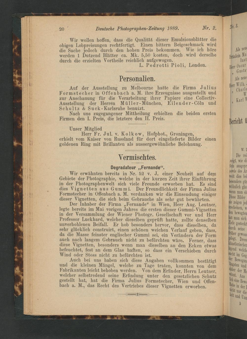 Unser Mitglied Herr Fr. Jul. v. Kolkow, Hofphot., Groningen, erhielt vom Kaiser von Russland für dort eingelieferte Bilder einen goldenen Ring mit Brillanten als aussergewöhnliche Belohnung.