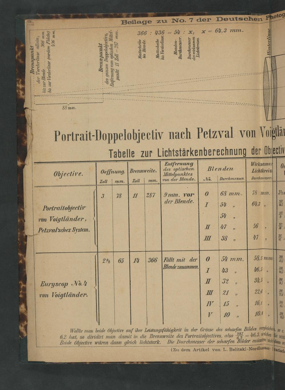 Tabelle Zul Lichtstärkenberechnung der Obeet Entfernung yirksamen 3 3 d k 2„ 2 ½, 00 Obfecti væę. Oefſuung. Brennwelle. Niaehnuriu Elen den Lichtkreis Zoll manr. VLoll V mnn. von der Blende. PHurchmessen Hurchmesser. 1 V 3„ I BAr Smm. vor OO bs mm. 7 mm. 2 der Blende. V. Portraitobfectiy 1 5 54„ 63„ 3 von Voigtländer, 37„ 3 etzral xclis S'slom. 2, d?„ 56„ 2 V Ill 9„ 7„ I. — 4—— 2% 65 da 56 kän mit der O à mm. 56 mm Blende zusammen. b 1 43„ 26,5„ u46 Furdgscon No. 4)?, Is, von Voigtländer. é, DW,s„ 43 „ 161„ a V 167 VF, 1hs 14 b Wollte man beide Objectire auf ihre Leistunggfäligkeit in der Grösse des schaufen Bildes wergleiches, 3, 6,2 hat, so dividirt man damit in die Brennw'eile des Partrailohfectives, also 2= 16,:, Vnldes 3 n BPeide Cbjectie wären dann Aleich lichtstark. Die Durannesser der sanarfen Bilder miussten siun gunn e —— I (Zu dem Artikel von I. Belitski-Nordhausen. ſpactiaa