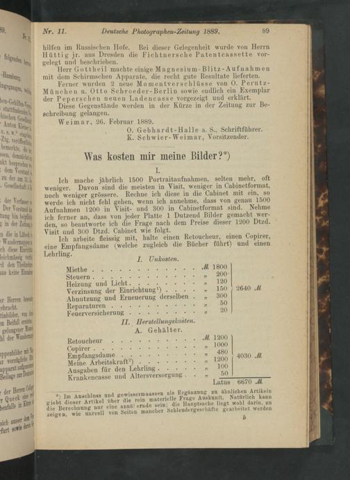 Ich mache jährlich 1500 Portraitaufnahmen, selten mehr, oft weniger. Davon sind die meisten in Visit, weniger in Cabinetformat, noch weniger grössere. Rechne ich diese in die Cabinet mit ein, so werde ich nicht fehl gehen, wenn ich annehme, dass von genau 1500 Aufnahmen 1200 in Visit- und 300 in Cabinetformat sind. Nehme ich ferner an, dass von jeder Platte 1 Dutzend Bilder gemacht wer- den, so beantworte ich die Frage nach dem Preise dieser 1200 Dtzd. Visit und 300 Dtzd. Cabinet wie folgt.